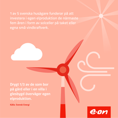 E.ON Sverige levererar el, värme och smarta energilösningar till drygt en miljon hushåll och företag. Vår roll är att driva energiomställningen framåt ihop med våra kunder, partners och samhället i stort. Tillsammans skapar vi smartare energi, med gemensam kraft.
