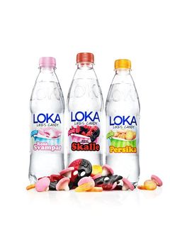 I år har några av de mest populära godisbitarna gett smak åt sommarens törstsläckare: Loka Likes Candy. Det innebär att vattnet smakar rosa svampar, persika och hallon/lakritsskalle.