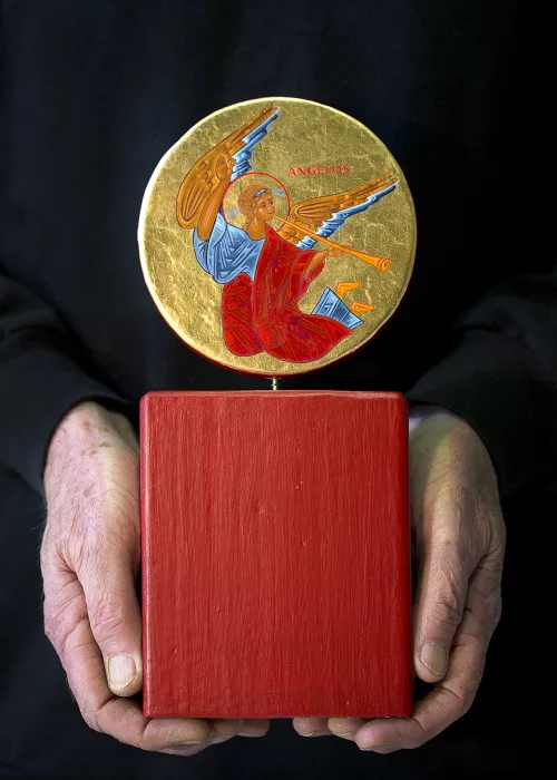 Erland Forsberg har med ikonen Angelos skapat en värdig symbol för Svenska kyrkans filmpris. Den lilla ikonen är cirkelrund – formen kommer från ett kameraöga.