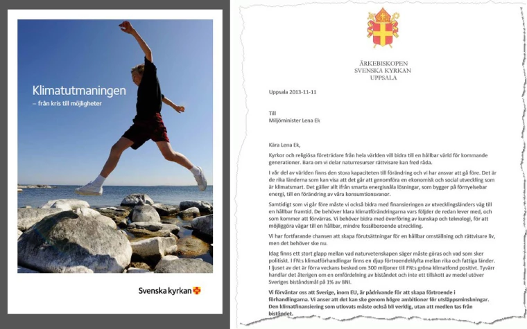 Idag presenterar Svenska kyrkan också rapporten ”Klimatutmaningen – från kris till möjligheter”. Den ger konkreta exempel och visar på de möjligheter som ligger i en klimatomställning av samhället. Det handlar om det offentliga, om näringslivet, om privatlivet, om kyrkor och organisationer. Rapporten har överlämnats till miljöministern.