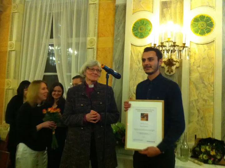 Skådespelaren Noof Ousellam, som spelar ”Omar” i filmen, mottog priset av biskop Antje Jackelèn. Foto: Maria Lundström.