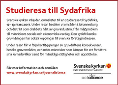 Studiebesöken kommer att koncentreras kring Johannesburg och gruvdistrikten i Rustenberg. Vi besöker projekt som Svenska kyrkans partner Bench Marks Foundation bedriver i gruvsamhällen. Bench Marks Foundation arbetar med så kallade ”community monitors”, dvs aktiva medborgare i sina egna lokalsamhällen. I sin kamp för bättre levnadsvillkor arbetar de bland annat via digitala plattformar för pekplattor och smarttelefoner. Det handlar om att dokumentera konsekvenserna av gruvnäringen och påverka gruvföretag och myndigheter, som vi också hoppas få besöka.