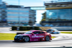 Race två fortsatte i inkörda hjulspår när 20-årige Morin bjöd på racingshow utan dess like när han körde om den ena bilen efter den andra framför en huvudläktare som fullkomligen kokade. Den unge norrlänningen manövrerade sig spektakulärt från åttonde till andra plats innan regnet började vräka ner över den nylagda asfalten, en svår situation även för den mest rutinerade av förare.