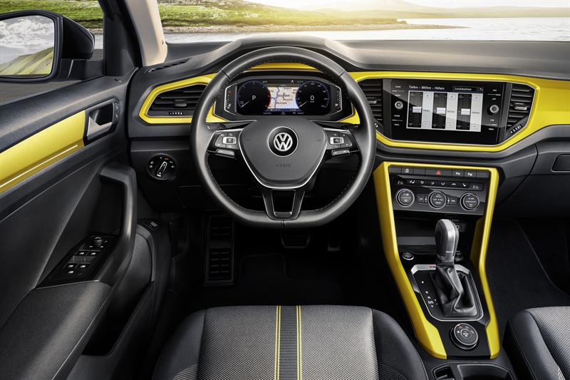 T-Roc har en kristallklar instrumenttavla som sträcker sig horisontellt i nivå med det högt placerade och därför lätt överskådliga infotainmentsystemet. 8"-displayen har en stor, helt inglasad yta vilket får infotainmentsystemet att se ut som en surfplatta. Instrumenten och infotainmentsystemet sitter integrerade i en elegant yta som löper från vänster till höger tvärs över hela instrumentpanelen. Beroende på utrustning kan denna yta vara lackerad i svart eller i en kontrasterande färg som i sin tur matchar sätesklädseln. Liknande färgklickar hittar vi också i dörrklädseln, beroende på utrustning.