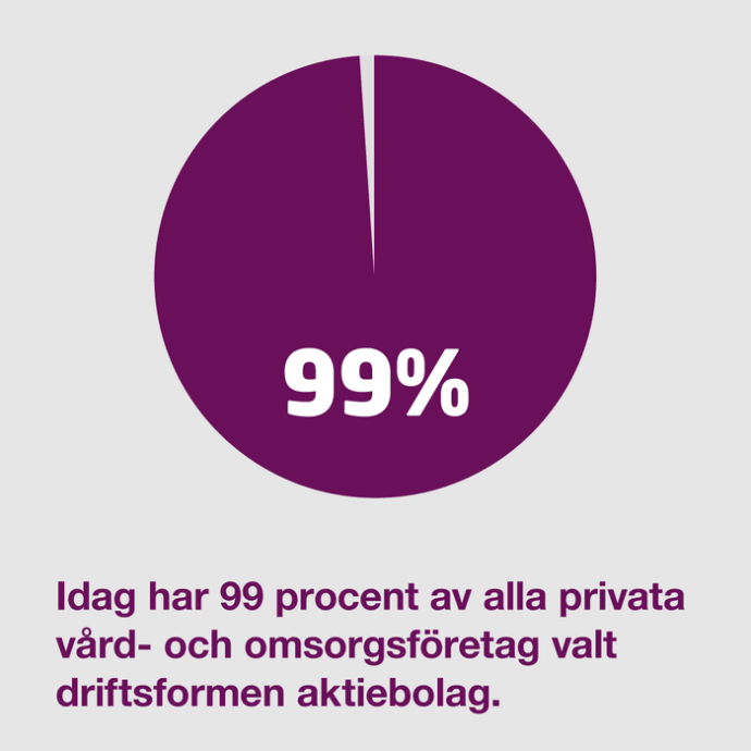 Idag har 99 procent av privata vård- och omsorgsföretag valt driftsformen aktiebolag. Två (2) är SVB-bolag, varav det ena står inför konkurs. Det är inte en slump att det inte finns fler ideella aktörer. Det vanliga aktiebolaget är helt enkelt en tryggare och säkrare bolagsform, det gäller i denna bransch som i alla andra.