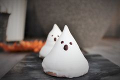 Lägg strösocker, florsocker, äggvita och kallt vatten i en stor bunke. Blanda gelatinpulvret med det heta, nyss uppkokade vattnet, och rör tills gelatinet löst upp sig helt. Börja vispa äggvite- och sockerblandningen och häll sedan ner den varma gelatinblandningen i en fin stråle. Vispa tills du har en fluffig smet och häll i vaniljsockret när smeten nästan är klar. Lägg ut Brago kex och spritsa på fyllningen till söta små spöken. Ställ i kylen så de stelnar alt. i frysen om det är bråttom. Smält vit choklad och häll i lite olja för att få chokladen tunnare och mer lättarbetad. Doppa mums-mumsen i den vita chokladen och låt stelna. Smält mörk choklad och spritsa på ögon och mun.