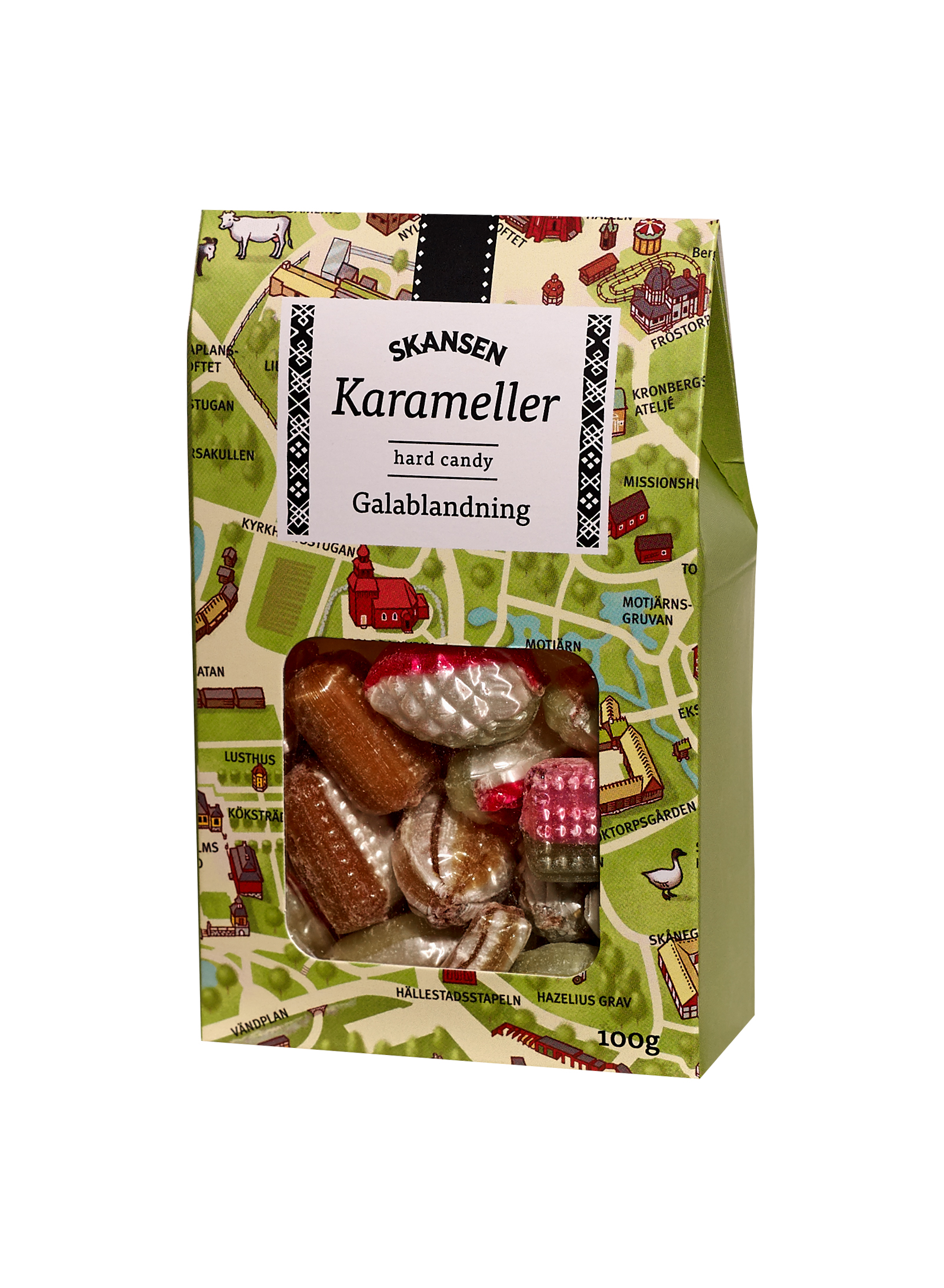Karameller, 100 gram, tryck Skansenkartan, 49 kr.