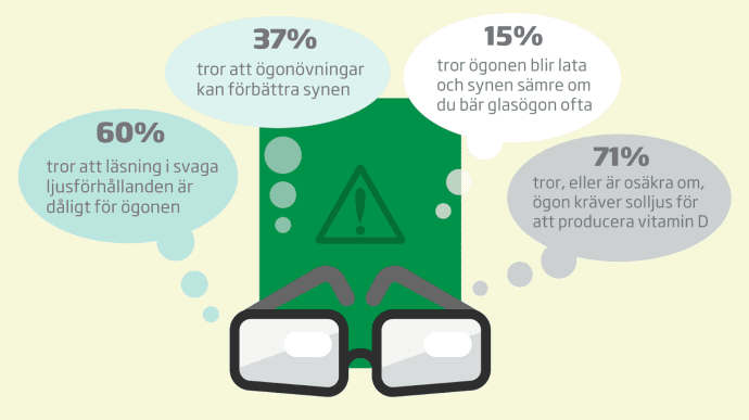 Endast ett fåtal av svenskarna (14 procent) vet att brist på fysisk träning kan leda till ögonsjukdomar och bara 18 procent känner till att övervikt kan leda till ögonsjukdomar. En av fem (20 procent) vet att grön starr är ett smärtfritt tillstånd och bara 29 procent vet att rökning kan orsaka ögonsjukdomar.