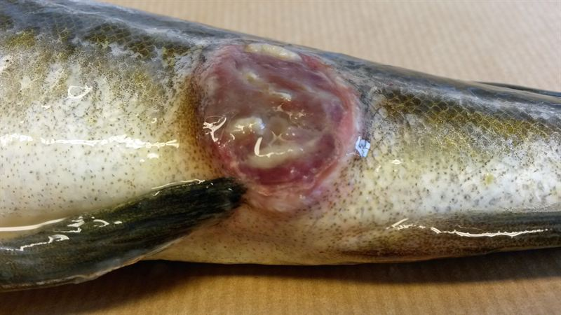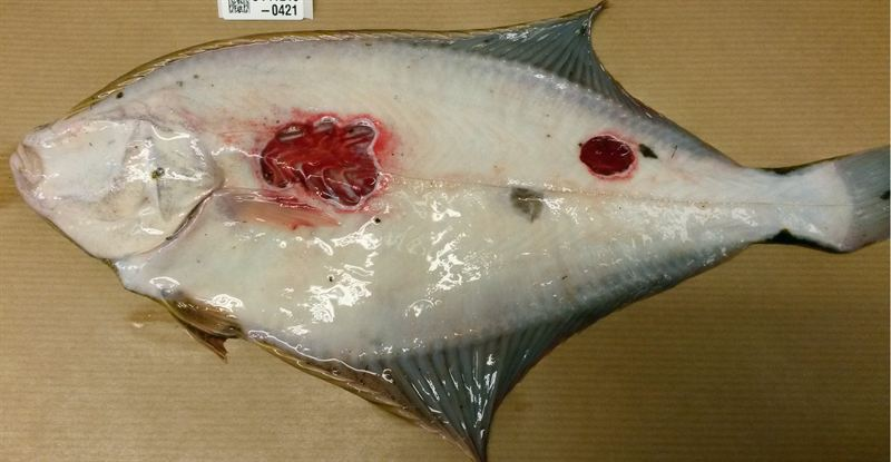 Skrubborna uppvisade en typ av runda ”frätskadeliknande” hudsår, framför allt på den opigmenterade sidan. Dessa har tidigare associerats med en särskild bakterie, som trivs i sediment i bräckt vatten som i Hanöbukten.