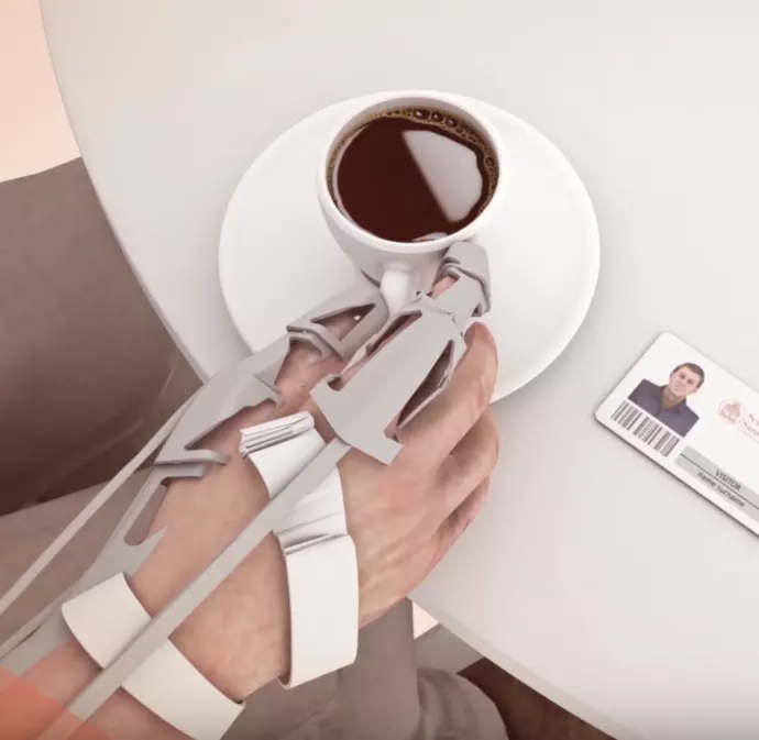 På Universitetet i Tübingen har ett vetenskapsteam för första gången lyckats med att delvis återfå händernas funktion hos ryggmärgsskadade med förlamning i både armar och ben (Tetraplegi). Det är med hjälp av ett hjärnstyrt hand-exoskelett, alltså en slags bärbar robot, som de sex testpersoner visade sig kunna använda sin förlamade hand i vanliga vardagssituationer. Neurorobotiken gör det bland annat möjligt för förlamade personer att äta själv.© Surjo R. Soekadar