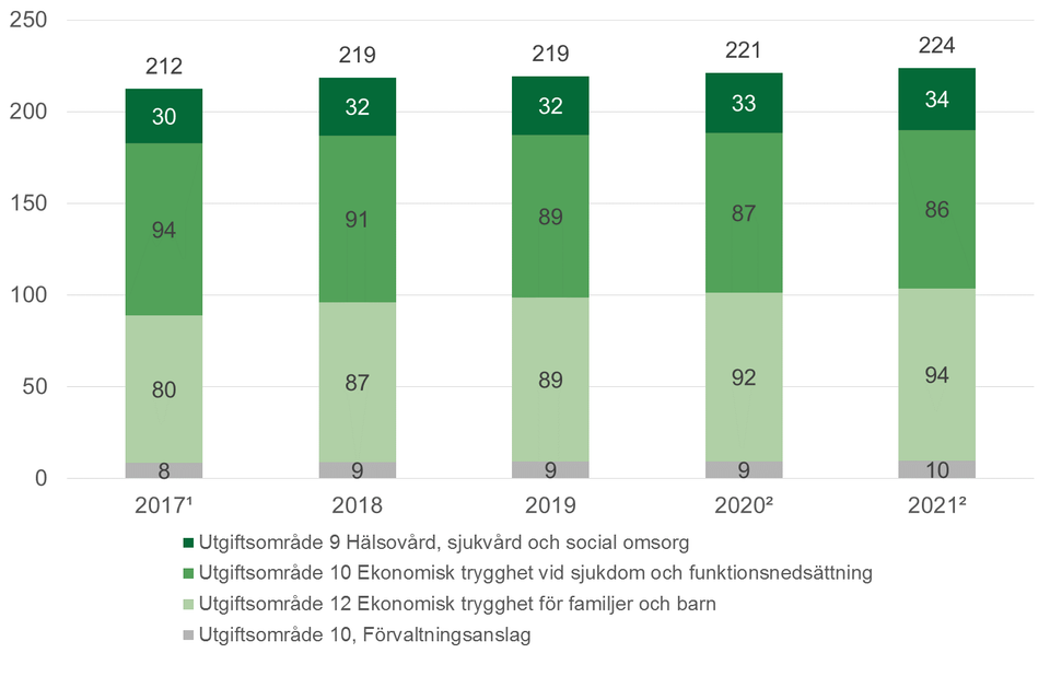 Ekonomisk trygghet vid sjukdom och funktionsnedsättning där sjukpenningen och aktivitets- och sjukersättningen är de största utgiftsposterna.