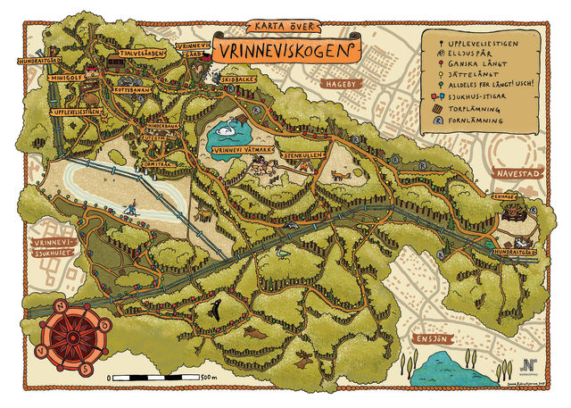 För att göra besöket i Vrinneviskogen extra spännande för yngre har kultur- och fritidskontoret tagit fram en karta som riktar sig till barn. Kartan är illustrerad av barnboksförfattaren Jonna Björnstjerna från Norrköping.