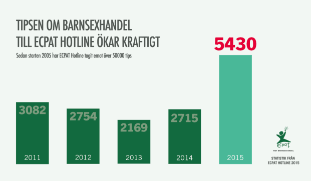 En ny rapport visar att ECPAT Hotline fick in dubbelt så många anmälningar om sexuell exploatering av barn på nätet 2015 jämfört med året innan. Under 2015 tog ECPAT Hotline emot 5 430 tips, jämfört med 2 715 året innan.