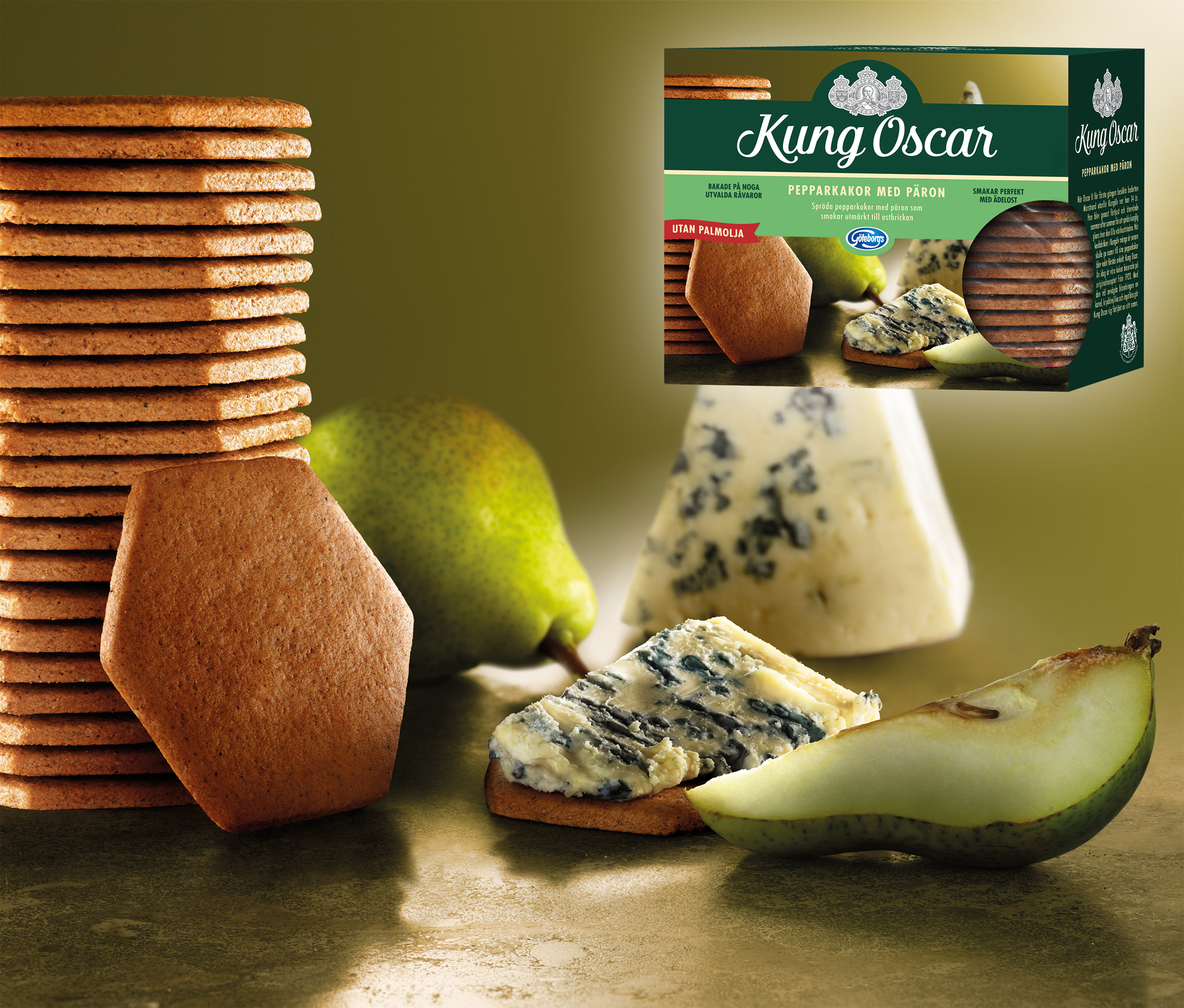 En googling på ”pepparkaka + ädelost” får ca 87 000 träffar. Att kombinationen med ädelost och pepparkaka är populär råder det inga tvivel om. Lagom till kommande glöggmingel kommer Göteborgs Kex med en ny peppakaka speciellt framtagen för att passa med ädelost – Kung Oscar Päron. Pepparkakans kryddiga sötma och sältan från osten passar perfekt tillsammans.