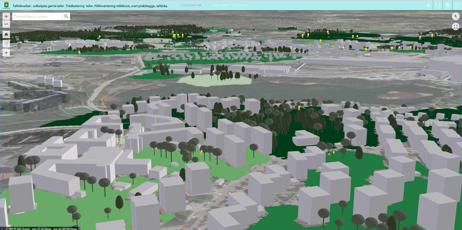 3D-modellen har tagits fram av Calluna AB i samverkan med Geografiska Informationsbyrån, som nu kommer att fortsätta utveckla trädapplikationen med många fler av stadens träd, i ett innovationsprojekt finansierat av Naturvårdsverket, i samarbete med Solna stad och Uppsala kommun. Projektet heter ”Webbapplikation för samarbete och synliggörande av trädens värden för hållbar stadsutveckling och förvaltning av stadens gröna infrastruktur”. Det betyder bland annat att tallarna i Solnas 3D-modell kommer att få sällskap av andra värdefulla trädarter som ekar och lindar framöver.