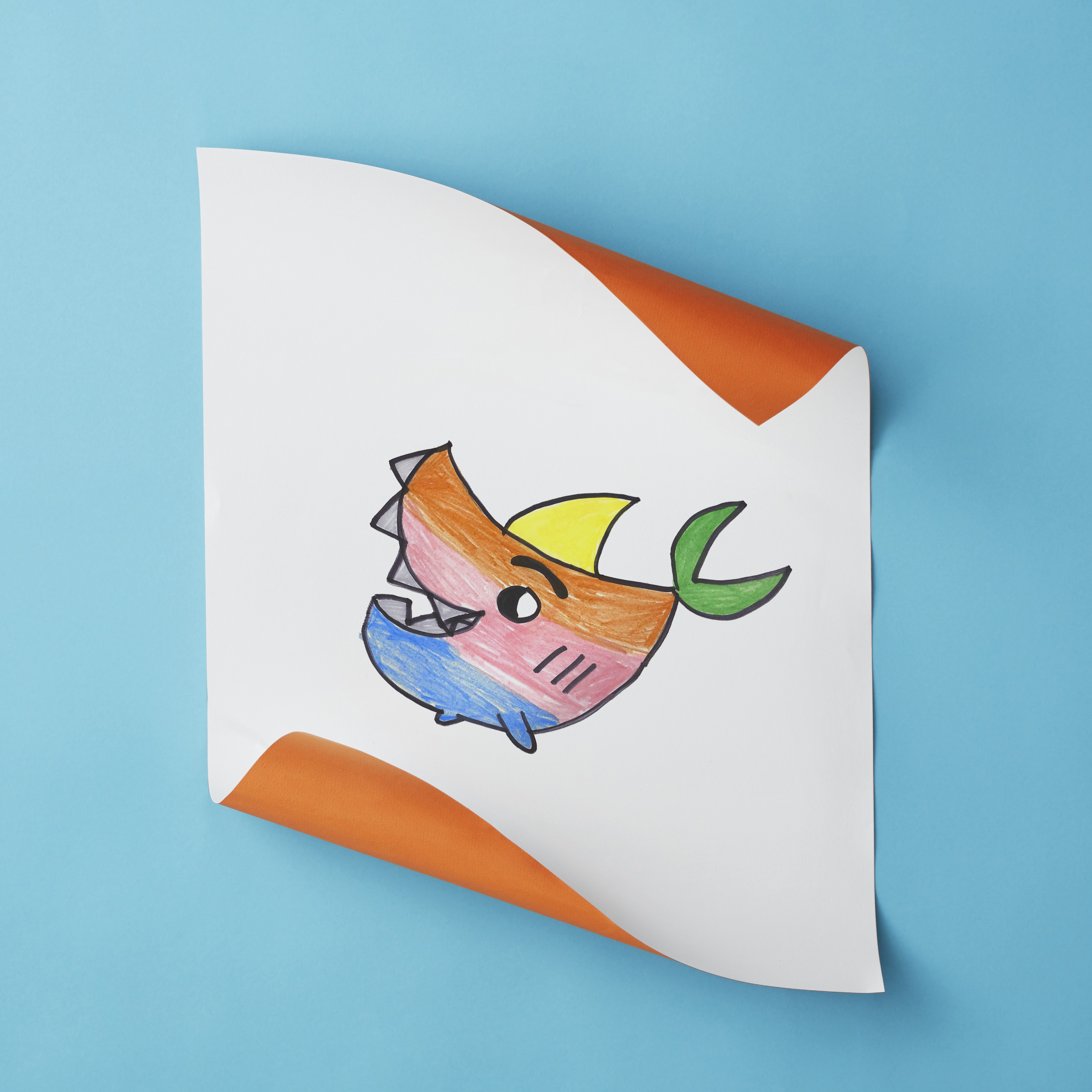 Haj: ”Jag målade en liten haj eftersom jag älskar att simma och vill simma tillsammans med den lilla hajen. På dagarna tror jag att han reser runt i havet.” Ritad av Jimin, 8 år från Sydkorea.”