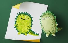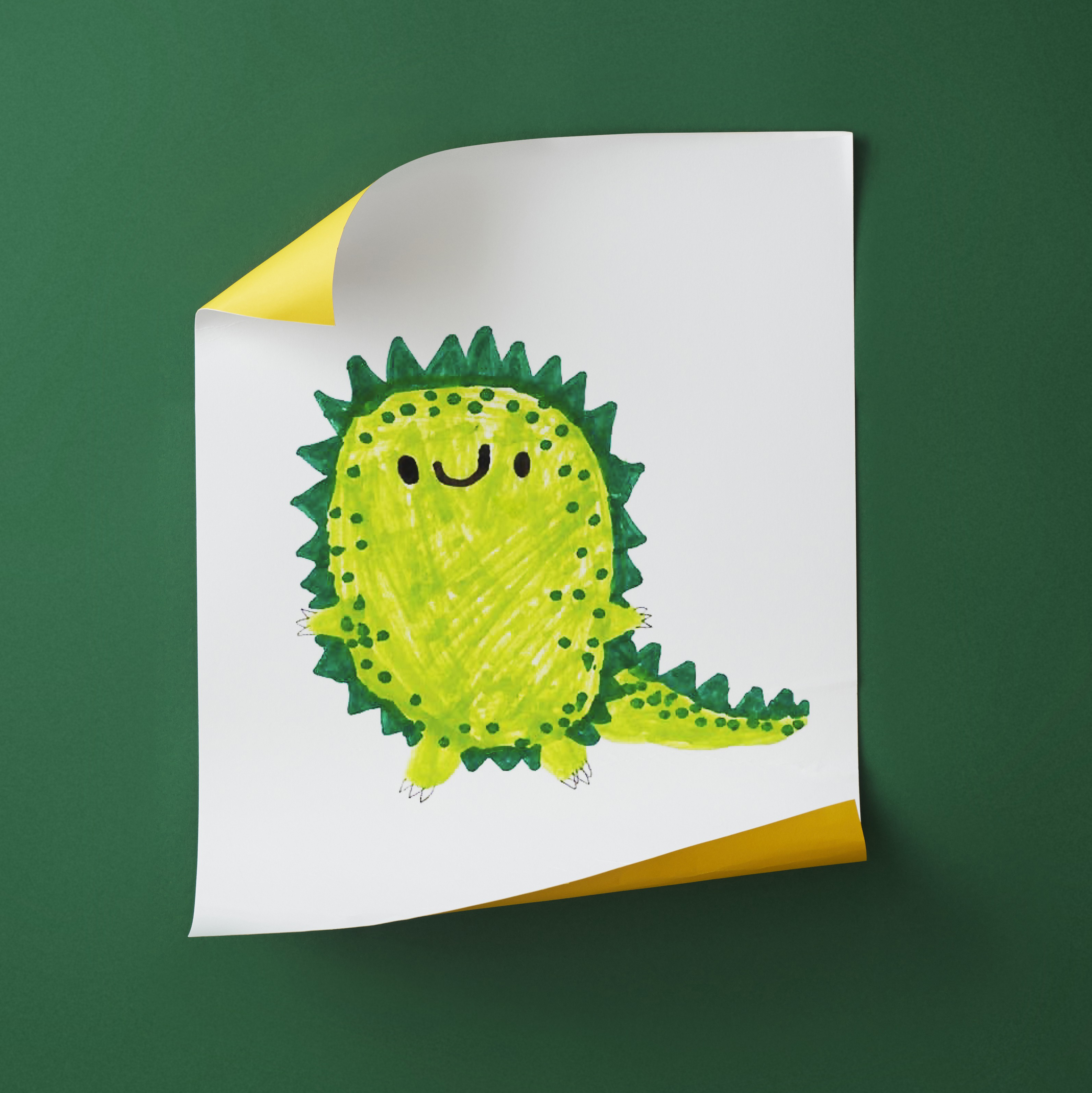 Igelkottsdinosaurie: ”Jag gjorde en mix av monster, igelkott och dinosaurie som jag målade grön, min favoritfärg. Den äter bara frukt och klättrar i regnskogens träd med sina vassa klor.” Ritad av Greta, 8 år, från Sverige.”