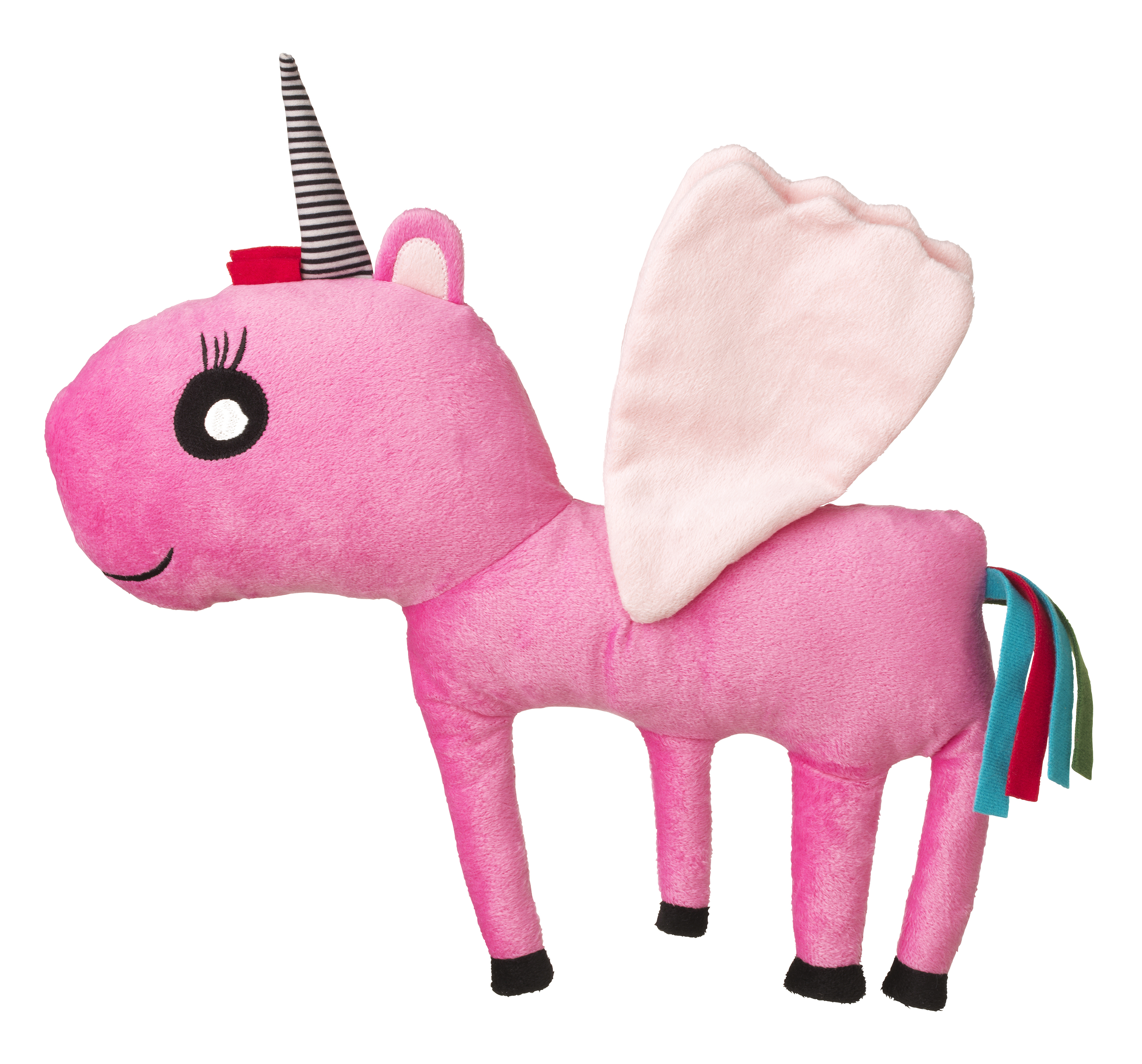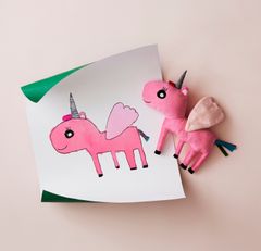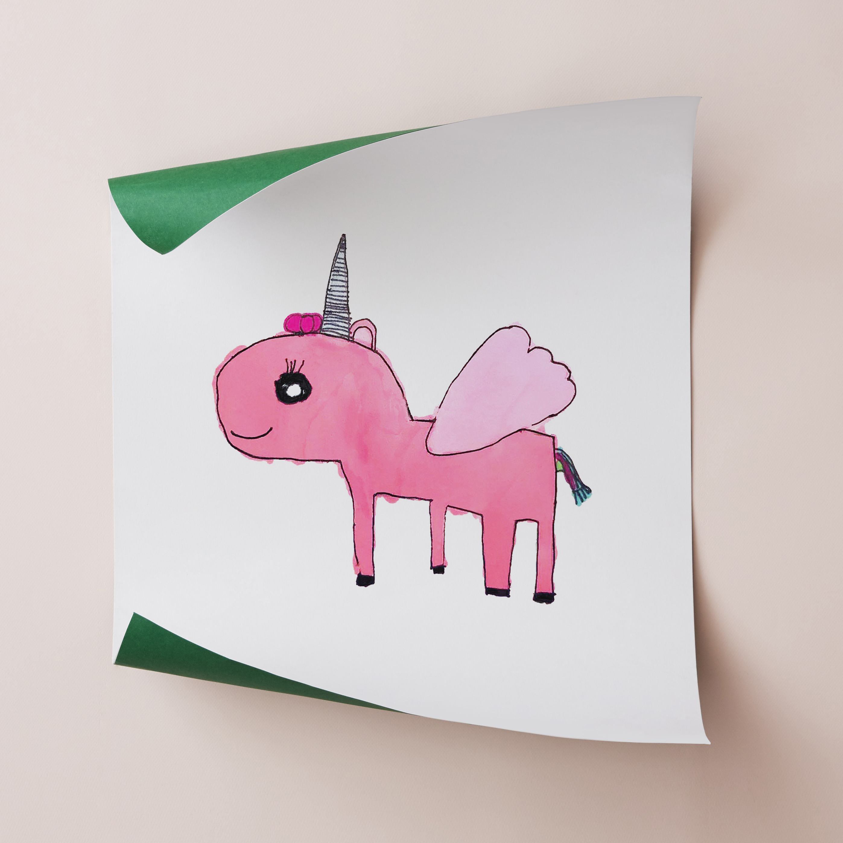 Enhörning: ”Jag målade en rosa enhörning som heter Rosa Enhörning och som älskar att flyga i himlen. Hoppas att andra barn i världen kan leka med mitt mjukdjur tillsammans med mig.” Ritad av Peixin, 5 år från Kina.”