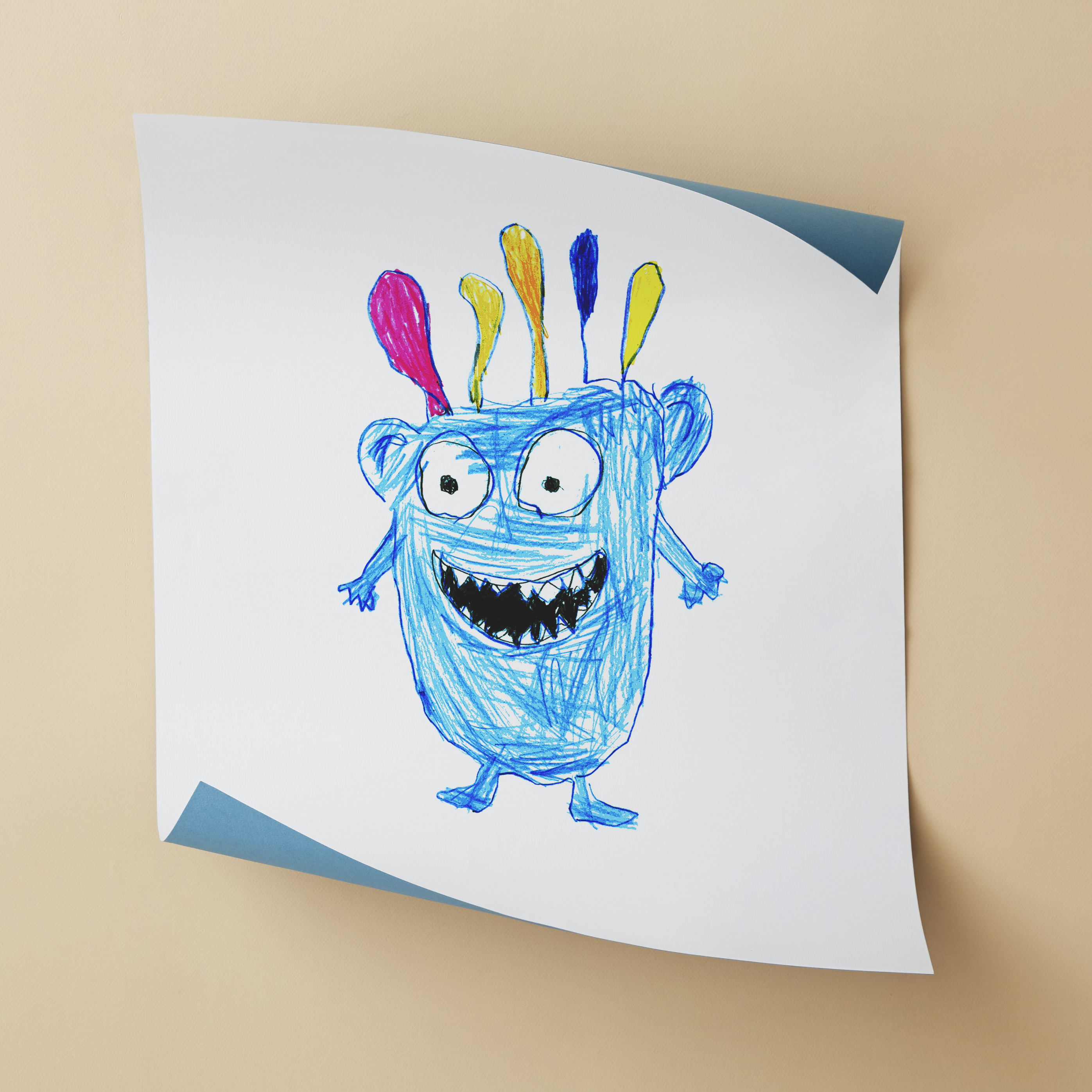 Monster: ”Jag ville måla något häftigt, så jag ritade ett monster. Hans namn är Monster och på dagarna skojar, retas och skämtar han hela tiden.” Ritad av Runar, 8 år, från Island.”