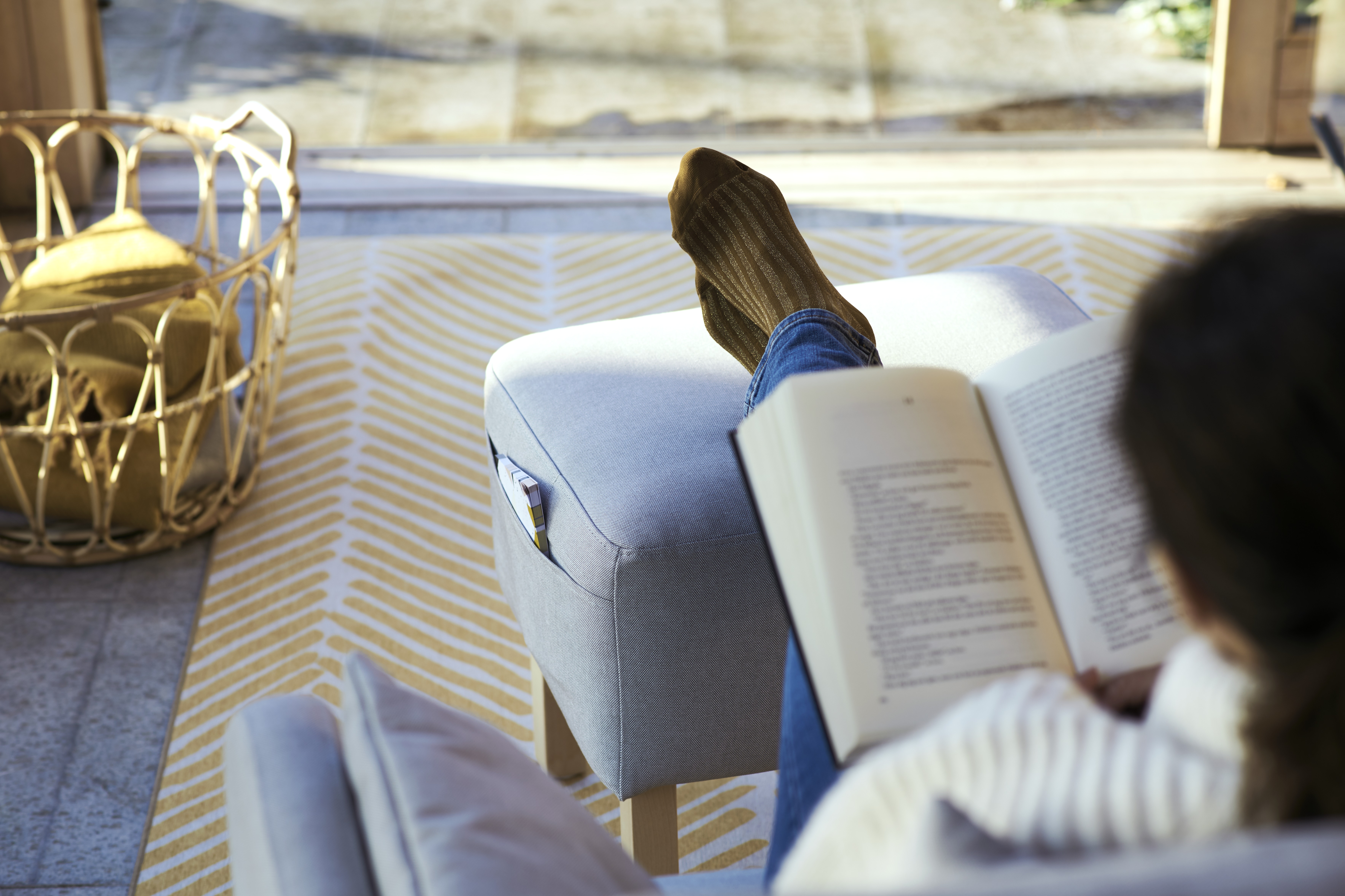 En liten och lätt fotpall till soffan eller fåtöljen kompletterar komforten – lätt att flytta med handtag på sidorna. I fickorna på sidan av fotpallen kan fjärrkontroll och andra småsaker förvaras.