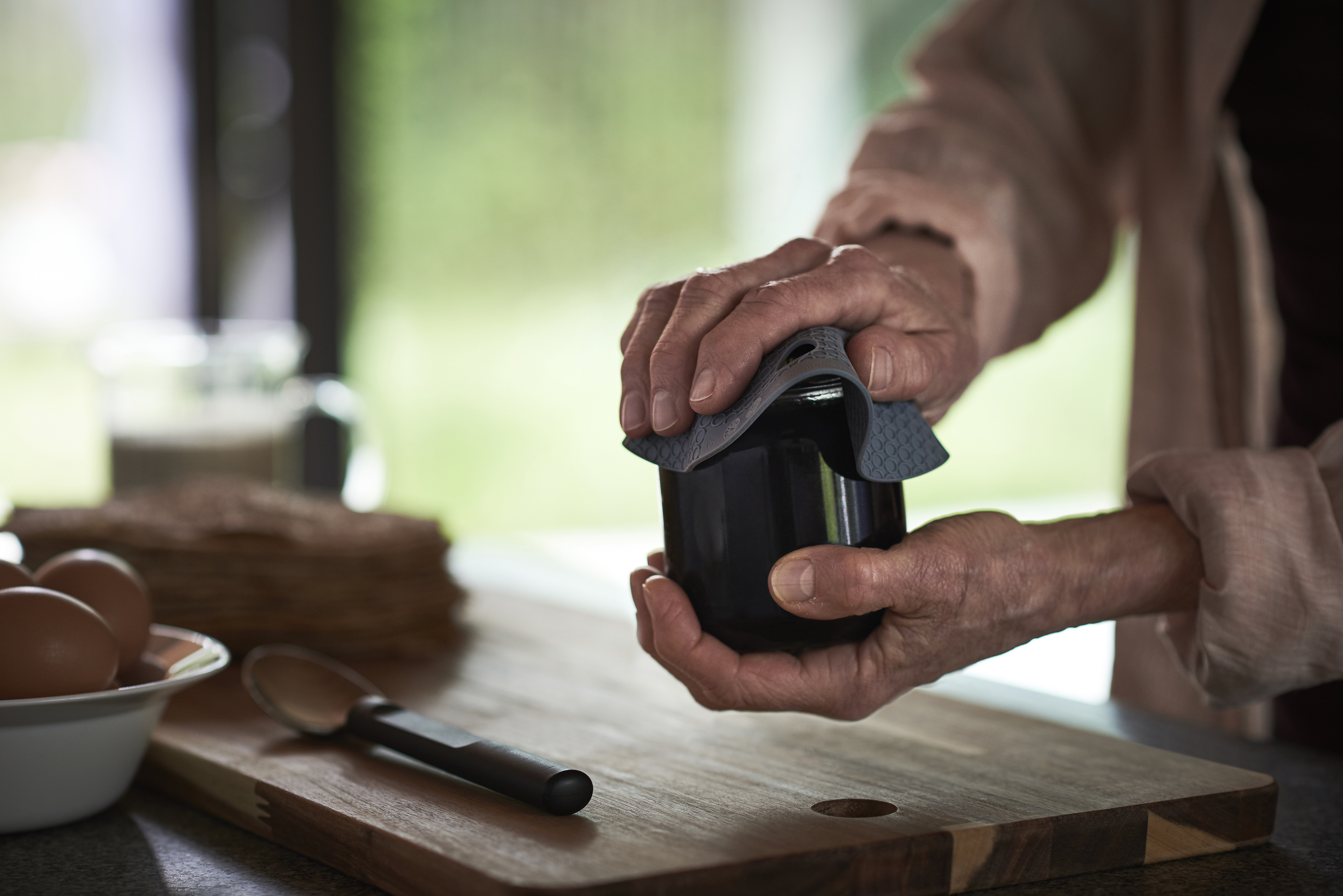 I OMTÄNKSAM sortimentet finns extra tåligt porslin som inte glider, greppvänliga bestick och en bekväm fåtölj som är lätt att resa sig ur. Även stödjande kuddar, tabletter med antiglid-yta och en greppduk för envisa burklock ingår i sortimentet.