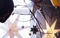 STRÅLA heter säsongsbelysningen som i år bjuder på många nyheter, däribland julstjärnor i naturmaterial, en ljuskrona i gråbetsad furu och storskaliga golvljusstakar som skapar stämning även i mörka hörn. All säsongsbelysning på IKEA är energisnål LED som sprider ett vackert, varmvitt ljus.