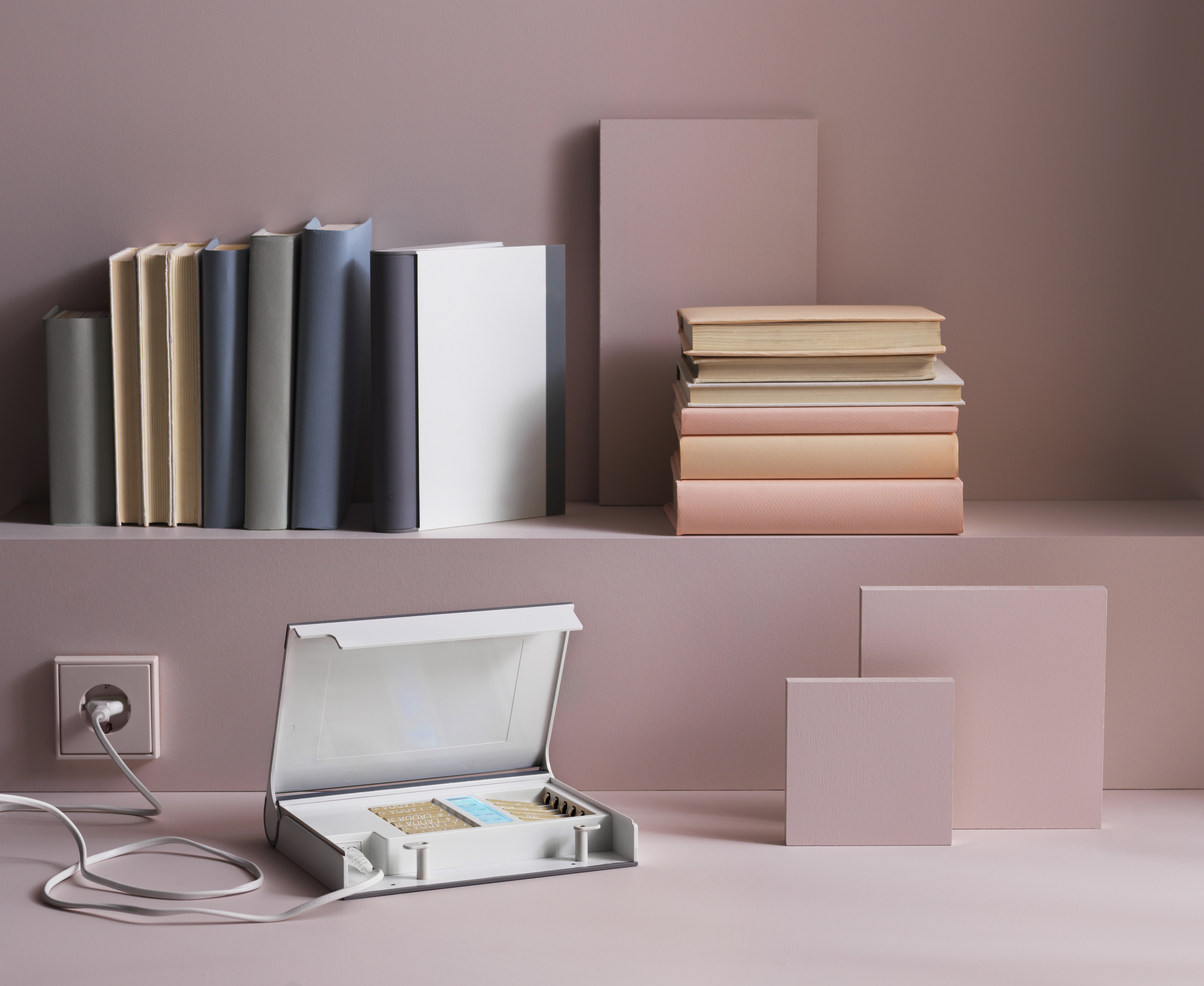 STORHÖGEN batteriladdare har plats för 1-12 batterier, med utrymme för både AA- och AAA-batterier. Batteriladdaren slår om till underhållsladdning när batterierna är fulladdade vilket gör att batterierna kan vara kvar i laddaren om du inte ska använda dem direkt. På så sätt är det enkelt att alltid ha fulladdade batterier hemma. STORHÖGEN batteriladdare har ett elegant och diskret utseende som liknar en bok, och passar därför perfekt till att placera mellan två böcker i bokhyllan. Du kan också montera den på väggen.