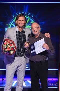 Det var en strålande glad vinnare som fick ta emot checken på en miljon kronor i PostkodMiljonären ikväll. Många har försökt, men få har lyckats ta sig hela vägen till miljonen. När kvällens program började hade Olle Laurell redan svarat rätt på 500 000-kronorsfrågan och var bara en fråga från att nå miljonen. Dessutom hade han en livlina kvar. Den sista frågan löd ”Vilket av följande länder har inte kust mot Kaspiska havet?”. När den lästes upp andades Olle ut. Den frågan kunde han. – Jag hade bestämt mig för att inte chansa när jag var uppe på de höga nivåerna men jag var helt säker på att svaret var Uzbekistan, säger han. Olle Laurell, 62, bor i Rönninge med sin fru Siv. Han har nyligen pensionerats från jobbet på Posten och ägnar nu tiden åt orientering, lösa korsord och föreningslivsaktiviteter. Korsorden, nyfikenheten och att han har lätt att lära sig nya saker tror han själv är anledningarna till sin allmänbildning och kunskaperna som ledde honom till vinsten. Vinstpengarna ska han använda till att ge hustrun Siv möjlighet att gå ner i arbetstid eller gå i pension för att de ska få mer ledig tid tillsammans. – För Olle var det ingen jakt på pengar utan ett spel. Han visade prov på enormt stor kunskap. För mig som mött närmare 400 tävlande i Heta stolen var det en njutning att bevittna Olles uppvisning på nära håll, säger programledaren Rickard Sjöberg. PostkodMiljonären är PostkodLotteriets eget TV-program. Det visas varje fredag och lördag klockan 19:30-20:00 i TV4. Den tävlande som sitter i den ”Heta stolen” ska svara på 15 frågor på sin väg mot miljonen. Personen har ett antal livlinor som används för att få hjälp med särskilt svåra frågor; han eller hon kan ringa en vän, välja bort två svarsalternativ, byta fråga eller fråga publiken. Bakom tv-programmet PostkodMiljonären står Svenska PostkodLotteriet som är ett välgörenhetslotteri med syftet att samla in pengar till organisationer som arbetar för en bättre värld för människor, djur och miljö. Hela överskottet från Lotteriet delas ut till 27 utvalda välgörenhetsorganisationer. Sedan starten i september 2005 har över en miljard kronor delats ut till välgörenhet. Över 850 000 svenska hushåll deltar i Lotteriet. Bilder från programmet finns att hämta på www.bildbanken.com Användarnamn: Postkodpress Lösenord: postkodbild För mer information kontakta: Emma Knutsson, kommunikatör på Svenska PostkodLotteriet Telefon: 08-562 488 28, 076-109 37 03 E-post: emma.knutsson@postkodlotteriet.se