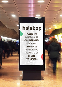Med hjälp av Trafikverkets data om förseningar i tågtrafiken och digitala storbildstavlor kan Halebop i realtid kommunicera med sina kunder. Är tåget 15 minuter försenat eller inställt syns annonsen och alla Halebopkunder kan då få 1GB fri surf genom att skicka ett sms.