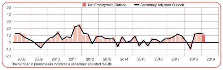Sysselsättningstrenden definieras som den andel arbetsgivare som tror att sysselsättningen ökar, minus den andel som tror att den minskar. Under det första kvartalet 2019 förväntar sig 9 procent av de svenska arbetsgivarna en ökad sysselsättning, 4 procent förväntar sig att minska arbetsstyrkan, 1 procent svarar vet ej och majoriteten (86 procent) förutser en oförändrad sysselsättning. Sysselsättningstrenden för Sverige blir då +5 procent och när siffrorna justerats utifrån säsongsvariationer blir sysselsättningstrenden +5 procent