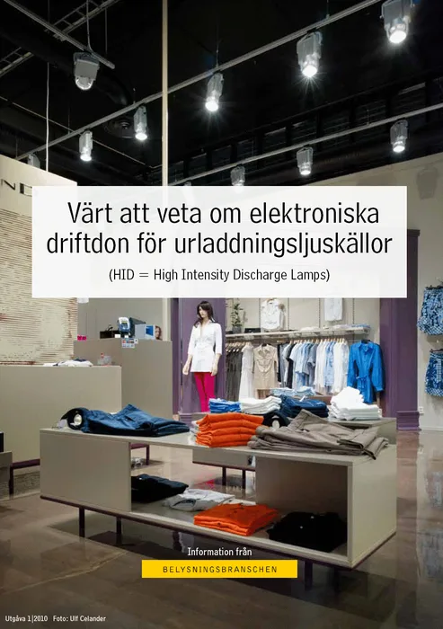 Ett typiskt användningsområde för elektroniska driftdon för urladdningsljuskällor är butiksbelysning. Elektroniska driftdon skapar idag de bästa förutsättningarna för en energieffektiv belysningsanläggning med högsta belysningskomfort och ger många fördelar jämfört med konventionella driftdon. En expertgrupp inom Belysningsbranschen har nu tagit fram ett informationsblad ”Värt att veta om driftdon för urladdningsljuskällor”.