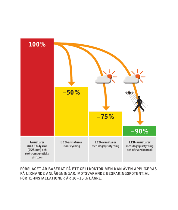 Ett område där besparingspotentialen är särskilt stor är belysning. Den snabba teknikutvecklingen inom framförallt LED-tekniken, i kombination med ett styrsystem som styr belysningen efter dagsljus och närvaro, gör det möjligt att spara upptill hela 90 procent energi. I många fall går det att nå en så pass hög besparing vid utbyte av belysningsanläggningar som inte har mer än 10-15 år på nacken.