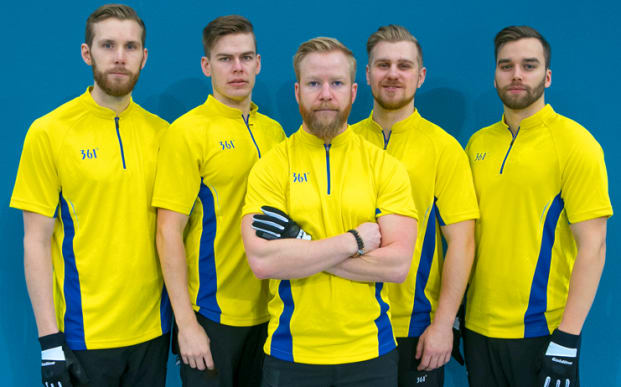 Sveriges trupp vid VM 2018: Niklas Edin, Oskar Eriksson, Rasmus Wranå, Christoffer Sundgren, Henrik Leek. Coach: Fredrik Lindberg. Förbundskapten: Peja Lindholm.