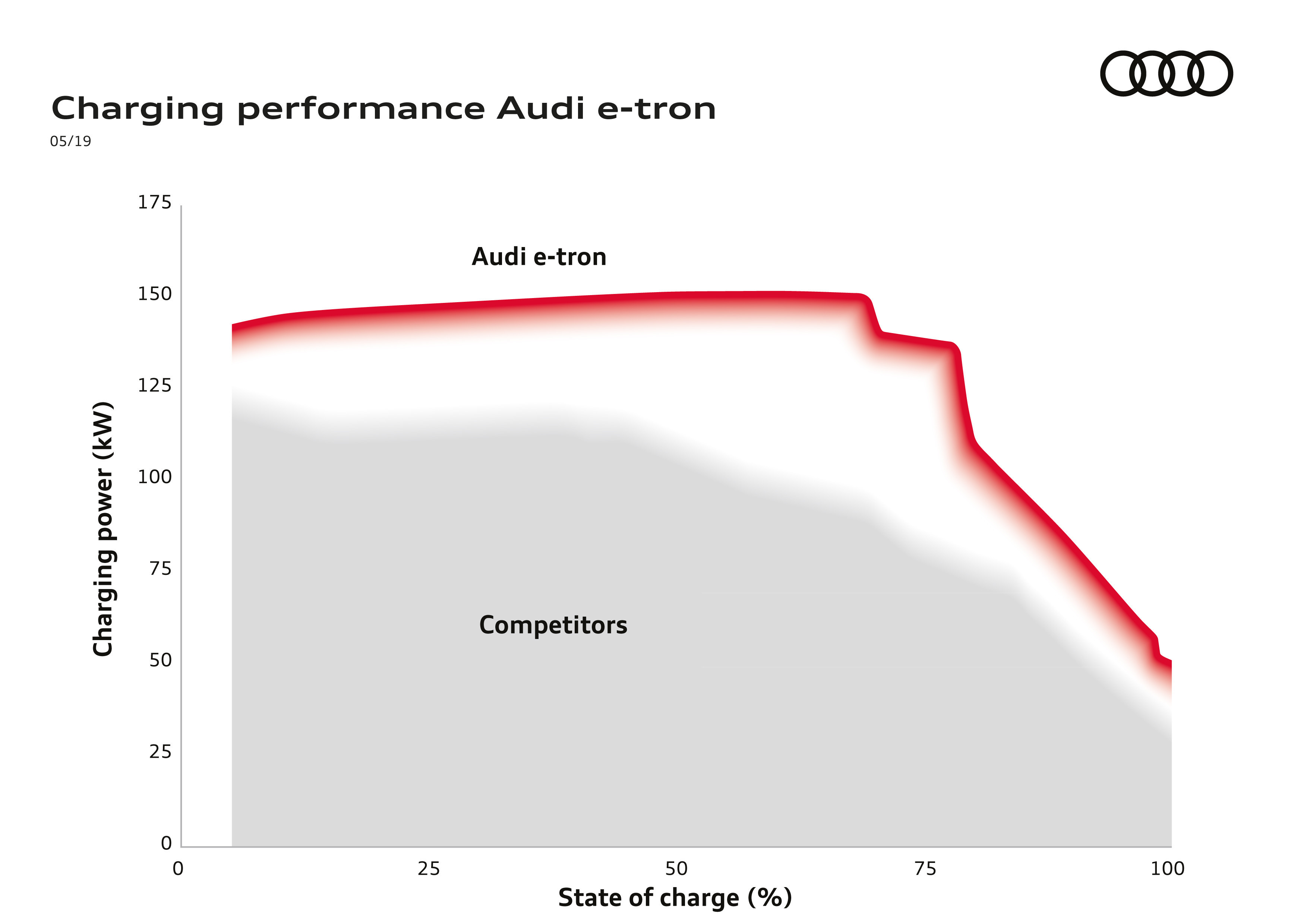 Audi e-tron sätter en ny standard när det gäller laddkapacitet. Inte bara för att den kan snabbladdas med 150 kW. Maxeffekten på 150 kW bibehålls dessutom över större delen av laddtiden, vilket är minst lika viktigt för att få maximal laddning på kortast tid.