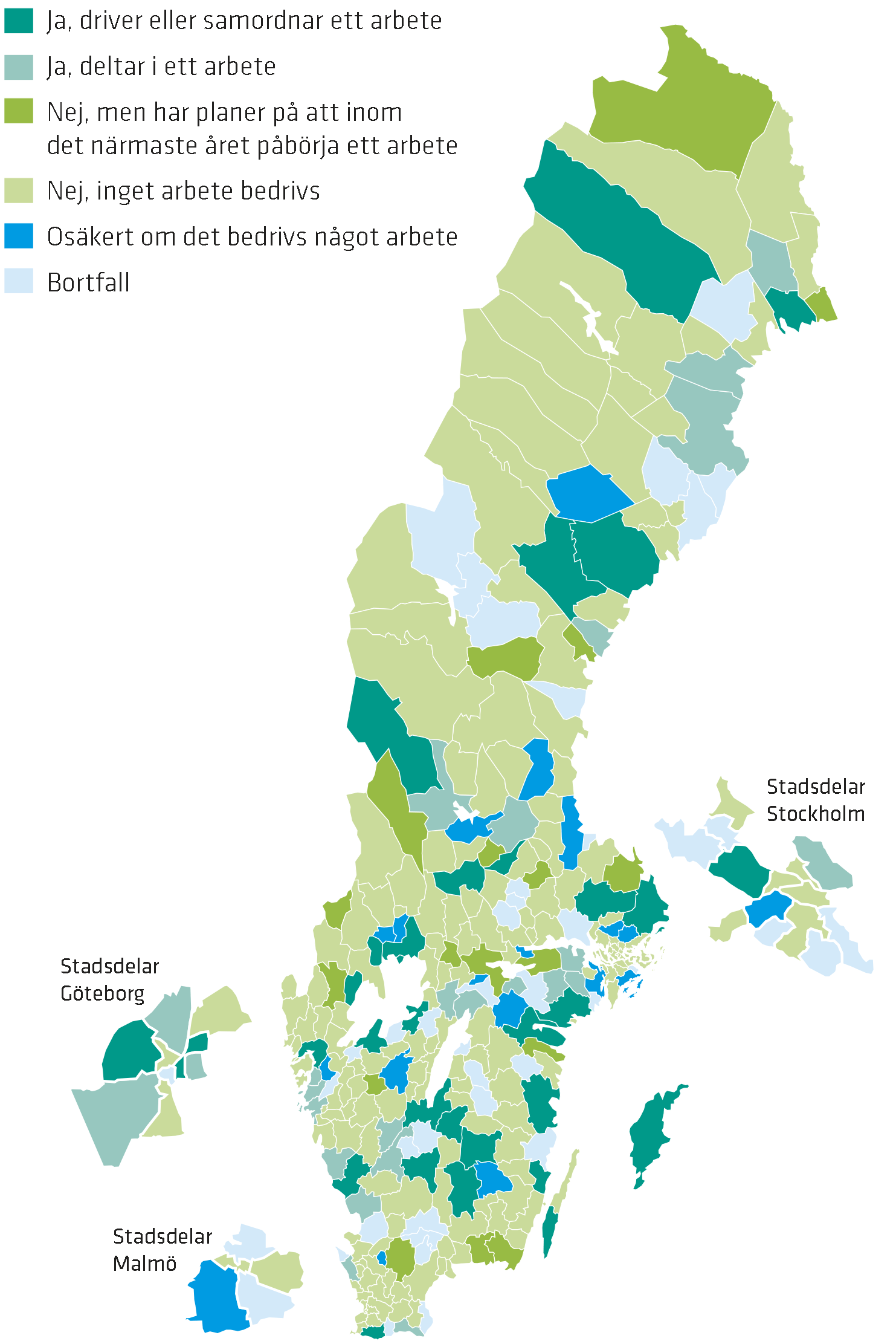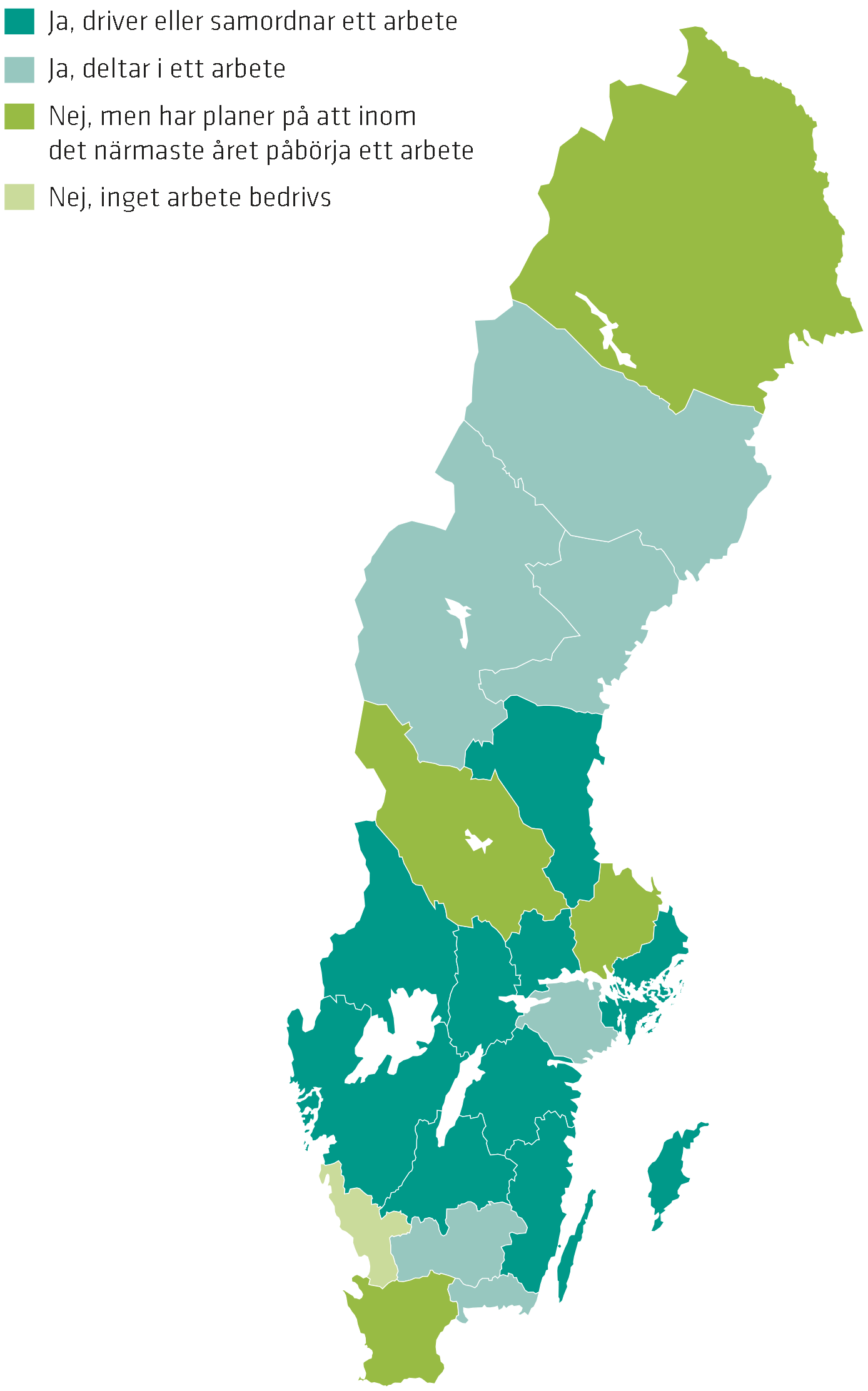 Arbetet med att förebygga självmord, suicid, är geografiskt spritt över Sverige. Det är framför allt landstingen som driver, samordnar eller deltar i ett suicidpreventivt arbete. Sju av tio landsting, 71 procent, arbetar med ett befolkningsinriktat arbete med uttalat mål att minska självmordstalen. Motsvarande andel bland kommuner och stadsdelar är 23 procent.