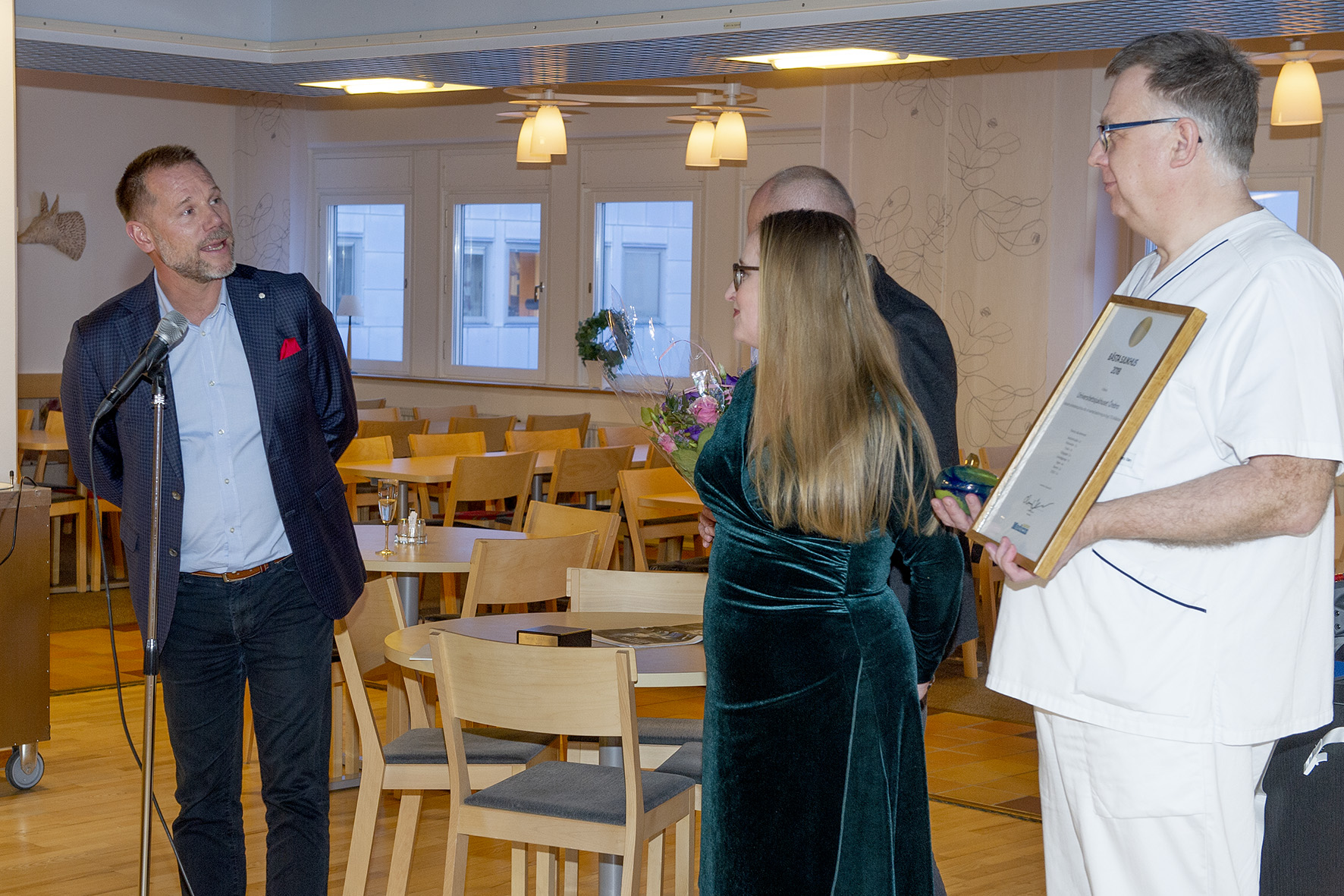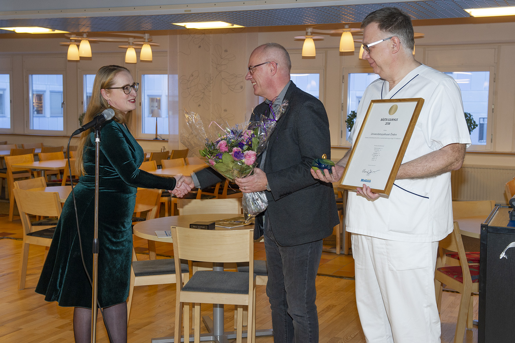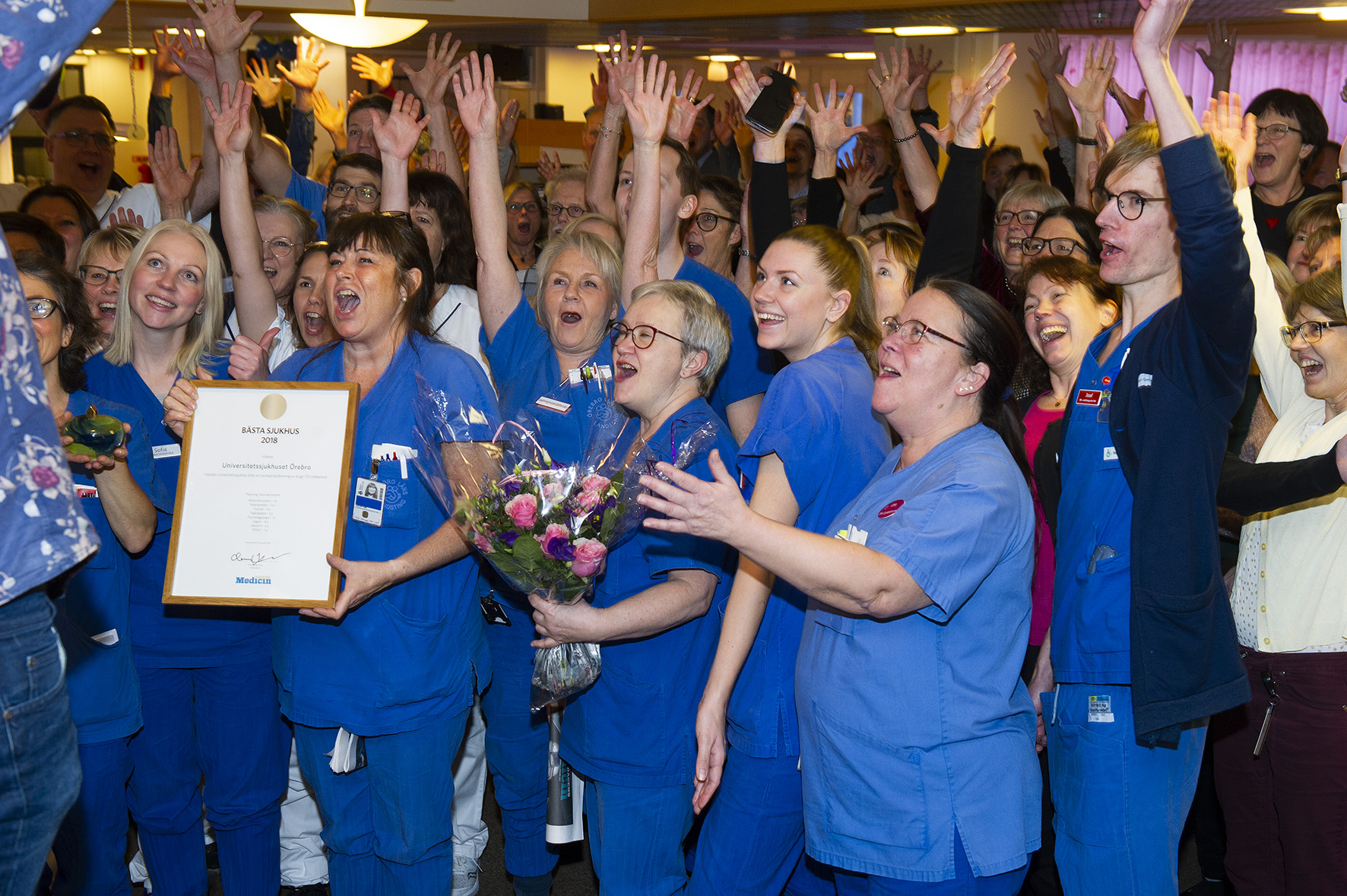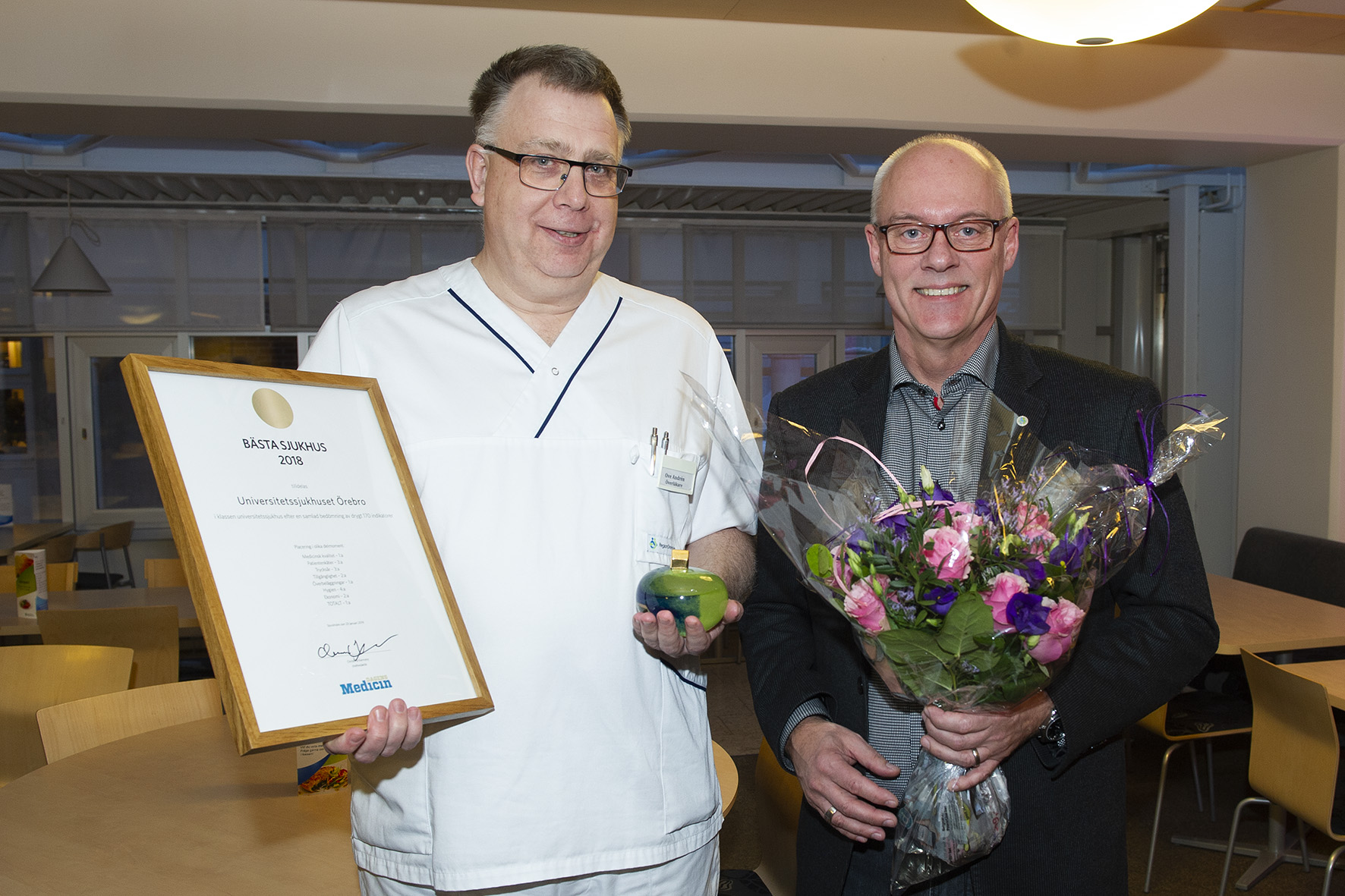 Lars Lundgren, hälso- och sjukvårdsdirektör i Region Örebro län fick ta emot diplom, blommor och en glasstaty i form av ett äpple. Han tackade personalen för att USÖ blivit Bästa sjukhus i klassen Universitetssjukhus.