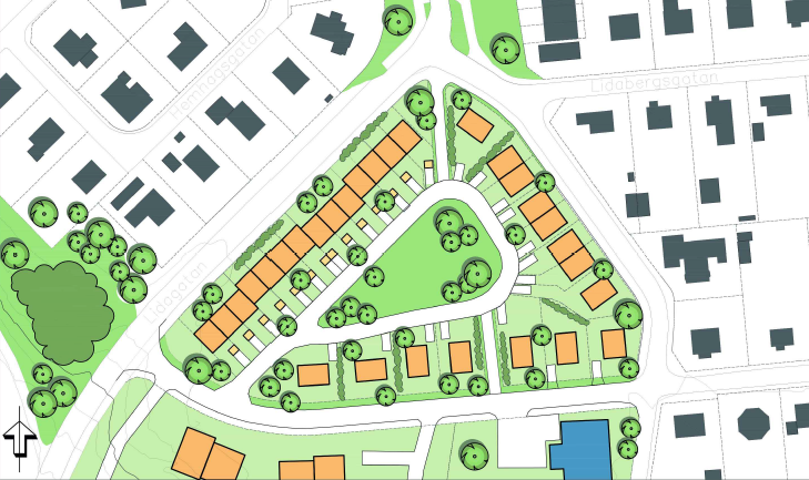 Marken avses användas för två områden med olika bebyggelsekaraktär, lägre och tätare radhus, parhus och friliggande hus i den norra delen och flerbostadshus i den södra delen tillsammans med skolområdet.
