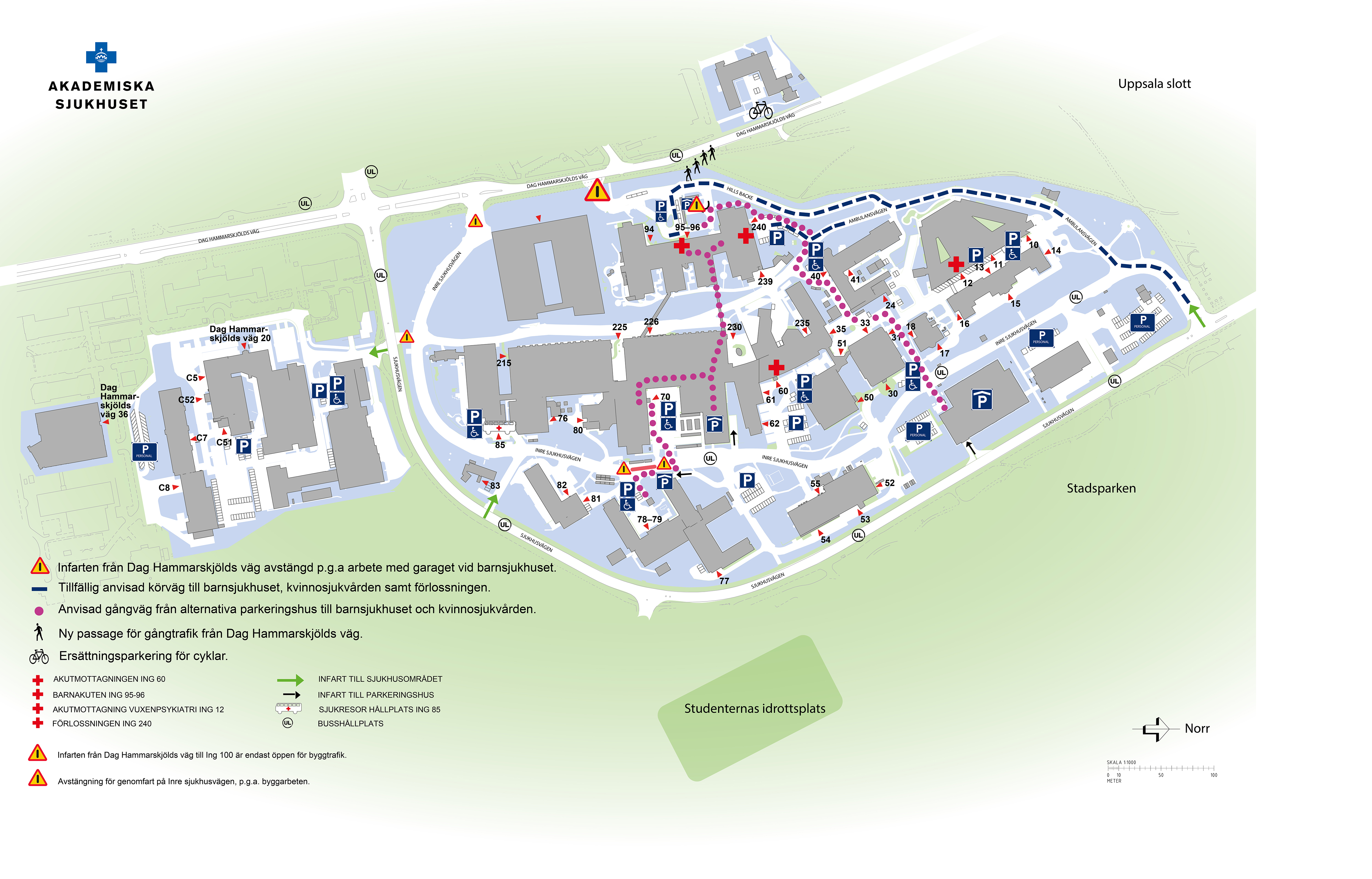 Som en följd av renoveringen stängs även den västra bilinfarten till Akademiska sjukhuset från Dag Hammarskjölds väg från den 1 november. Besökare som kommer med bil hänvisas till den norra infarten, mittemot Svandammen/Stadsträdgården. Detta gäller fram till hösten 2019, då en ny väg från Dag Hammarskjölds väg fram till ingång 95/96 beräknas tas i bruk.