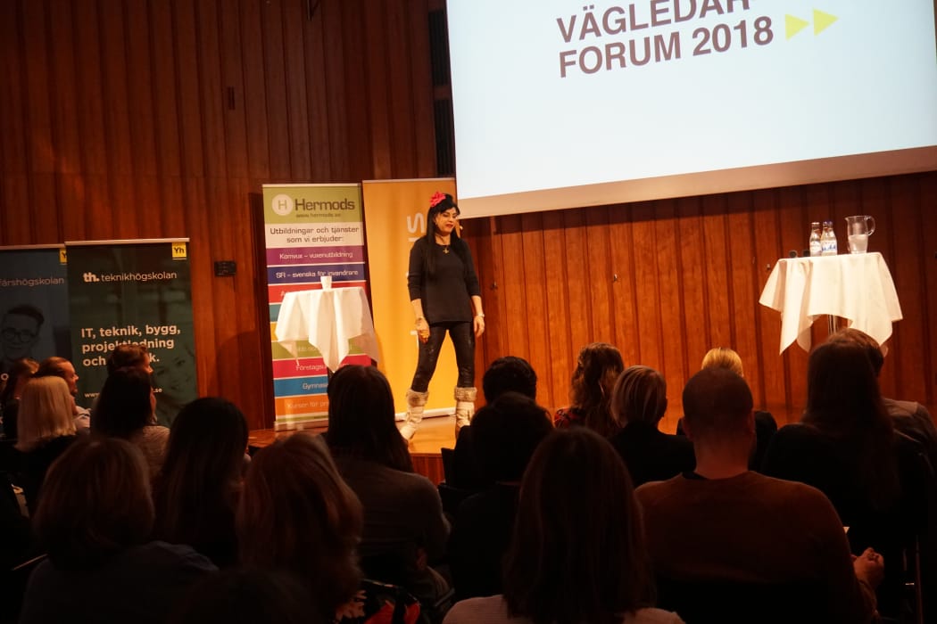 Zinat Pirzadeh, som är SYV, författare och ståuppkomiker, föreläste om vägledning för nyanlända. Zinat Pirzadeh kom själv till Sverige som vuxen och i sin föreläsning blandar hon humor med berättelser om de utmaningar man står inför som nyanländ i ett land där man varken förstår språket eller alla sociala och kulturella koder.
