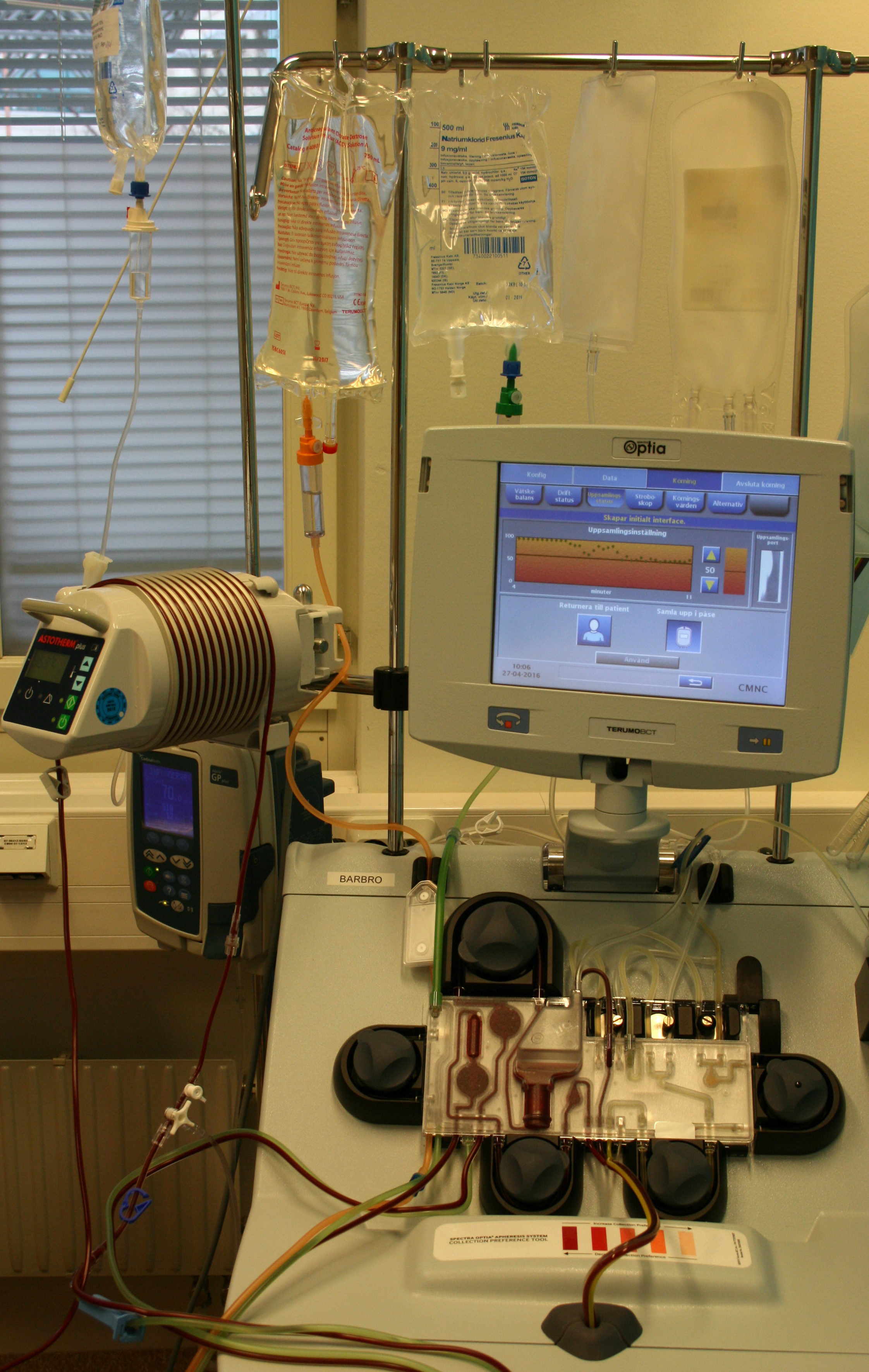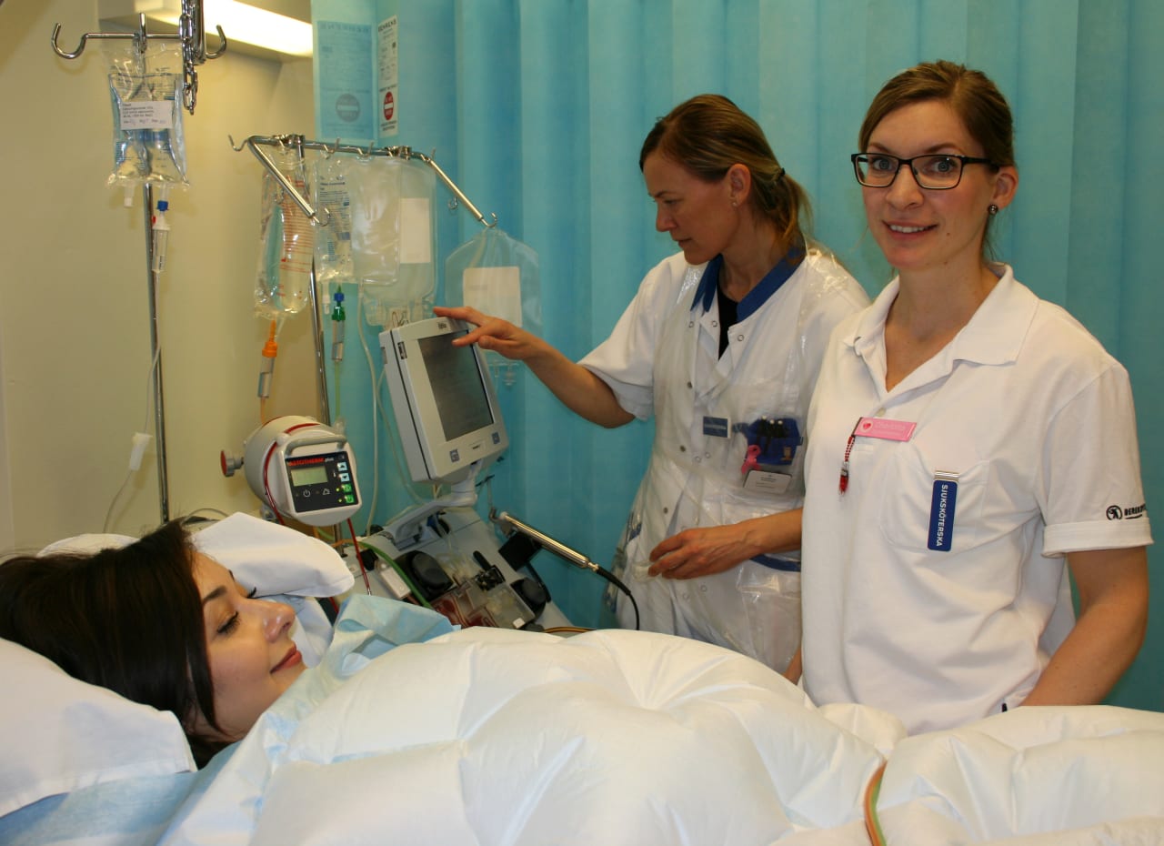 Kristin Vedung och Charlotta Besev (närmast i bild), sjuksköterskor på Blodcentralen, skördar blodstamceller från donatorn Sarah Movahedi. Dessa celler ska senare användas för transplantation. Via en så kallad aferesmaskin separeras och koncentreras stamcellerna med centrifugeringsteknik. Processen tar cirka fem timmar.