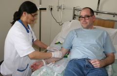 Patrik Sköldberg opererades för tre månader sedan. Vi träffas vid ett återbesök då han genomgår en måltidsbelastning för att testa blodsockervärdet och se hur mycket insulin kroppen tillgodogör sig från transplantatet. Ett mål med behandlingen är ett jämnare blodsockervärde och allra helst att patienterna ska slippa ta insulin.