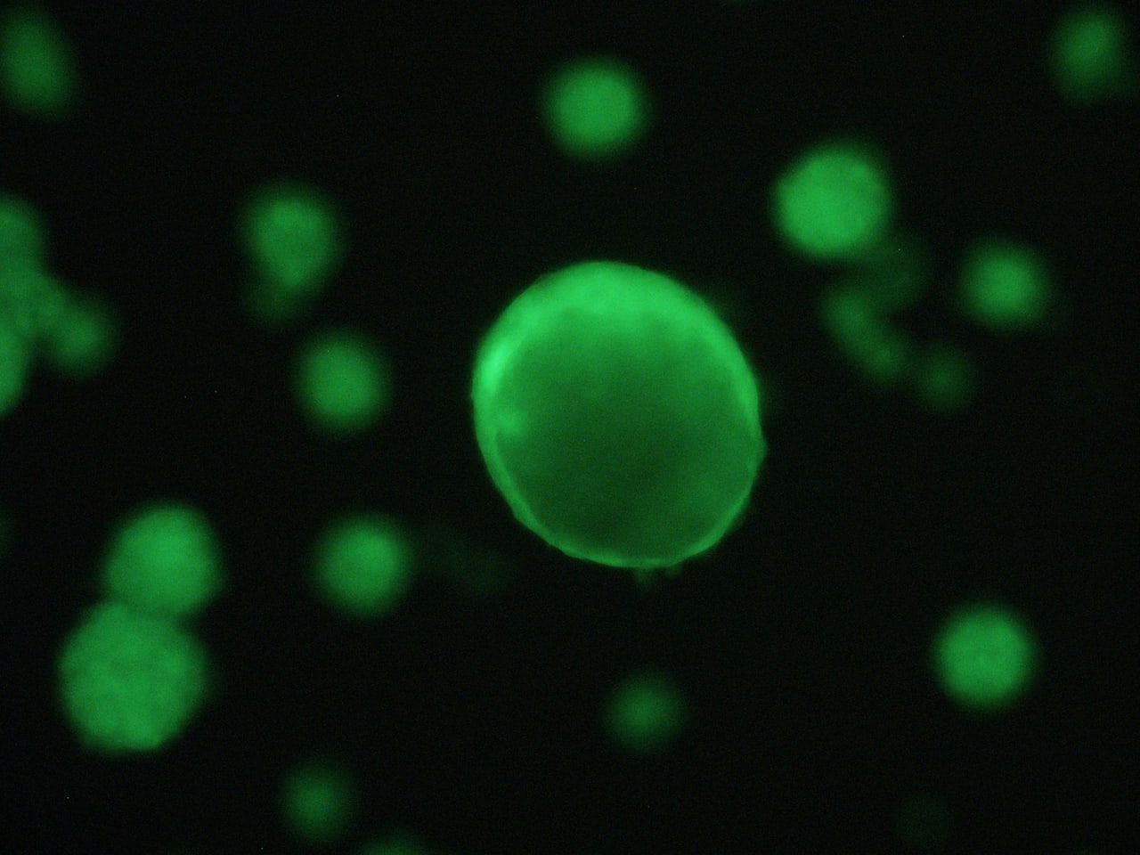 Bildtext: Insulinproducerande cellöar tillsammans med fluorescerande gröna neuronala stamceller i en odlingsskål. Inom några timmar täcks öcellernas yta helt av stamcellerna.