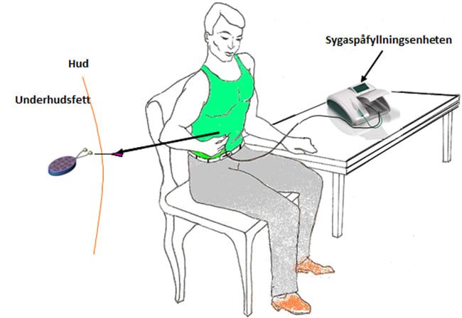 * I mitten av dosan finns en syrgastank som fylls på av patienten ungefär en gång per dygn. Syrgasen tillförs via injektionsport under huden