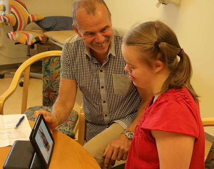 – Mycket föll på plats när Sofia utreddes och fick sin diagnos. Vi hade ju misstankar om att hon var autistisk innan, men nu kan hon få bättre stöd i skolan. Hon tycker mycket om att arbeta med/titta på bilder i sin surfplatta, säger Christer Olofsson, pappa till 19-åriga Sofia, som deltar i utvecklingsprojektet och tidigare var med i studien ADHD och autism vid Downs syndrom.