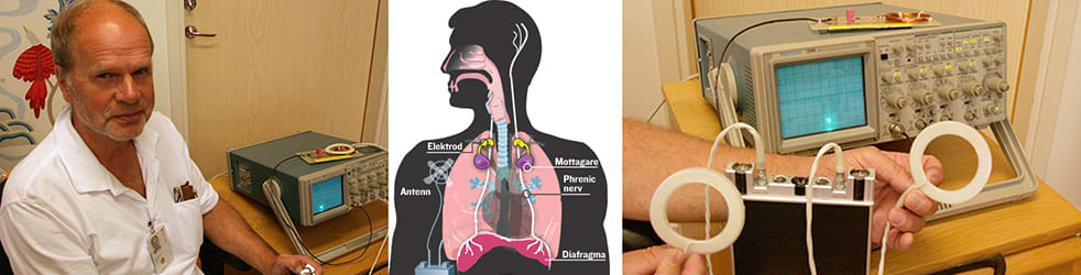 * Via ett mindre kirurgiskt ingrepp ovanför nyckelbenet opererar neurokirurgen in elektroder på frenikusnerven som kopplas till mottagare placerade på bröstkorgen.