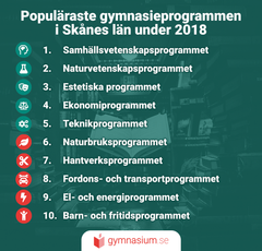 Söktjänsten gymnasium.se är med sina 300 000 besök i månaden landets största portal för information om gymnasievalet. Sajten har nu sammanställt besöksstatistiken för 2018 och listar de mest besökta programmen i varje län. I Skåne län är det i stort samma program i övriga landet som är mest populära.