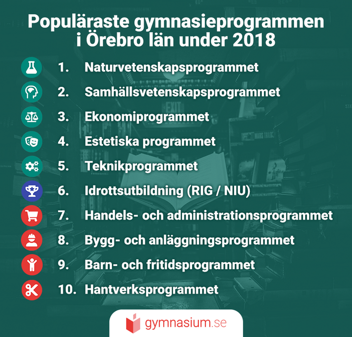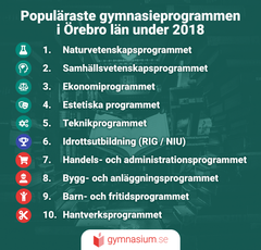 Fem högskoleförberedande program - Naturvetenskapsprogrammet, Samhällsvetenskapsprogrammet, Ekonomiprogrammet, Estetiska programmet samt Teknikprogrammet - är de program som flest örebroare letat information om under 2018. Därefter, före yrkesprogrammen, kommer Idrottsutbildning som nummer sex på topplistan i Örebro län. Av yrkesprogrammen är det Handels- och administrationsprogrammet, Bygg- och anläggningsprogrammet samt Barn- och fritidsprogrammet som flest besökt.