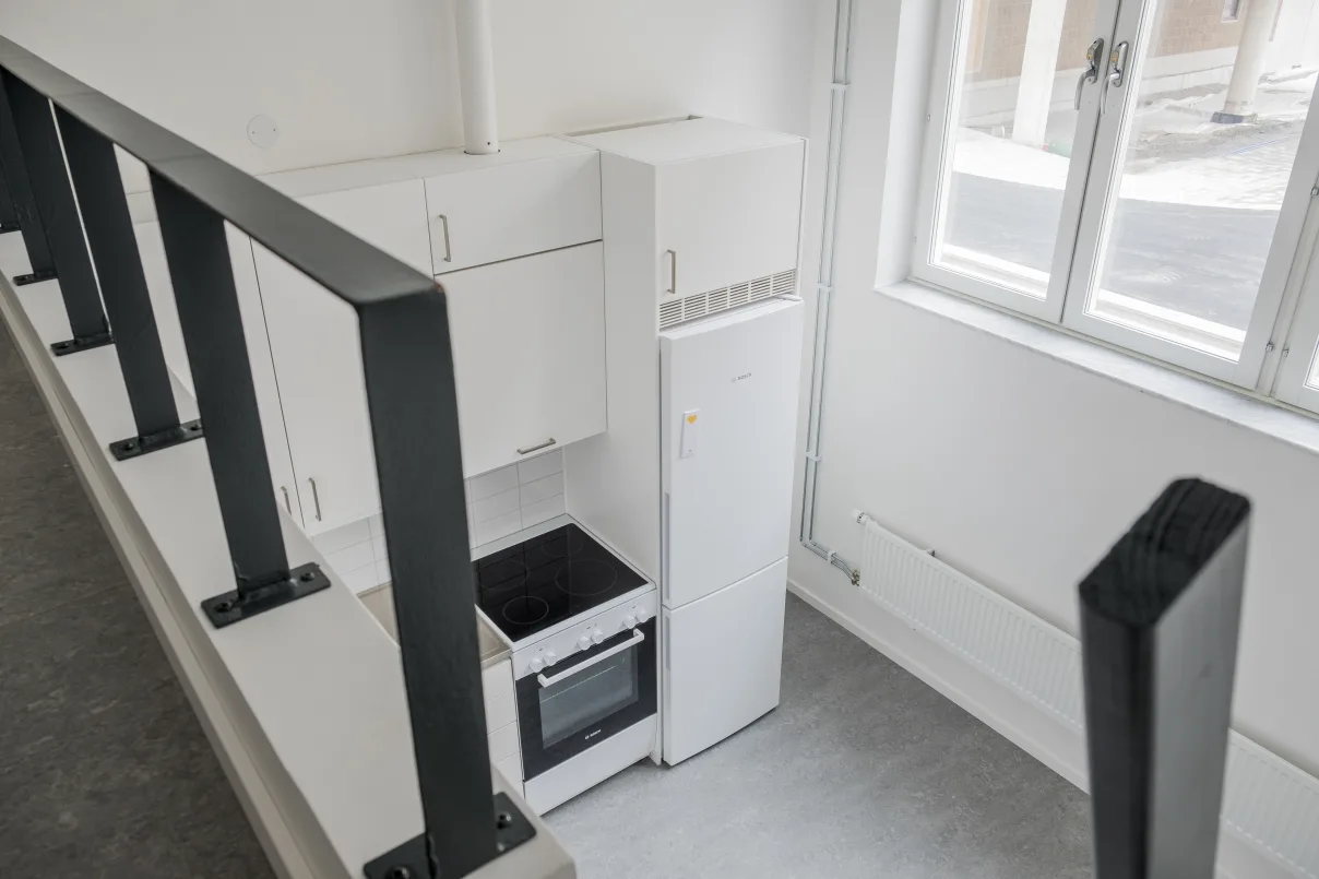 Familjebostäder har omvandlat ett gammalt kontorshus till moderna studentbostäder med känsla för den ursprungliga arkitekturen. Stor hänsyn har tagits för att tillvarata de kvalitéer som fanns i byggnaden, med hög takhöjd, råa betongytor som har målats vita. Alla lägenheter har eget kök och ett rymligt badrum, byggda enligt dagens tillgänglighetskrav. Exteriört har den gula tegelfasaden fräschats upp. Högst upp finns en nybyggd takterrass som väntar på att studenterna att ta den i anspråk, där man ser ut över den framväxande stadsdelen.
