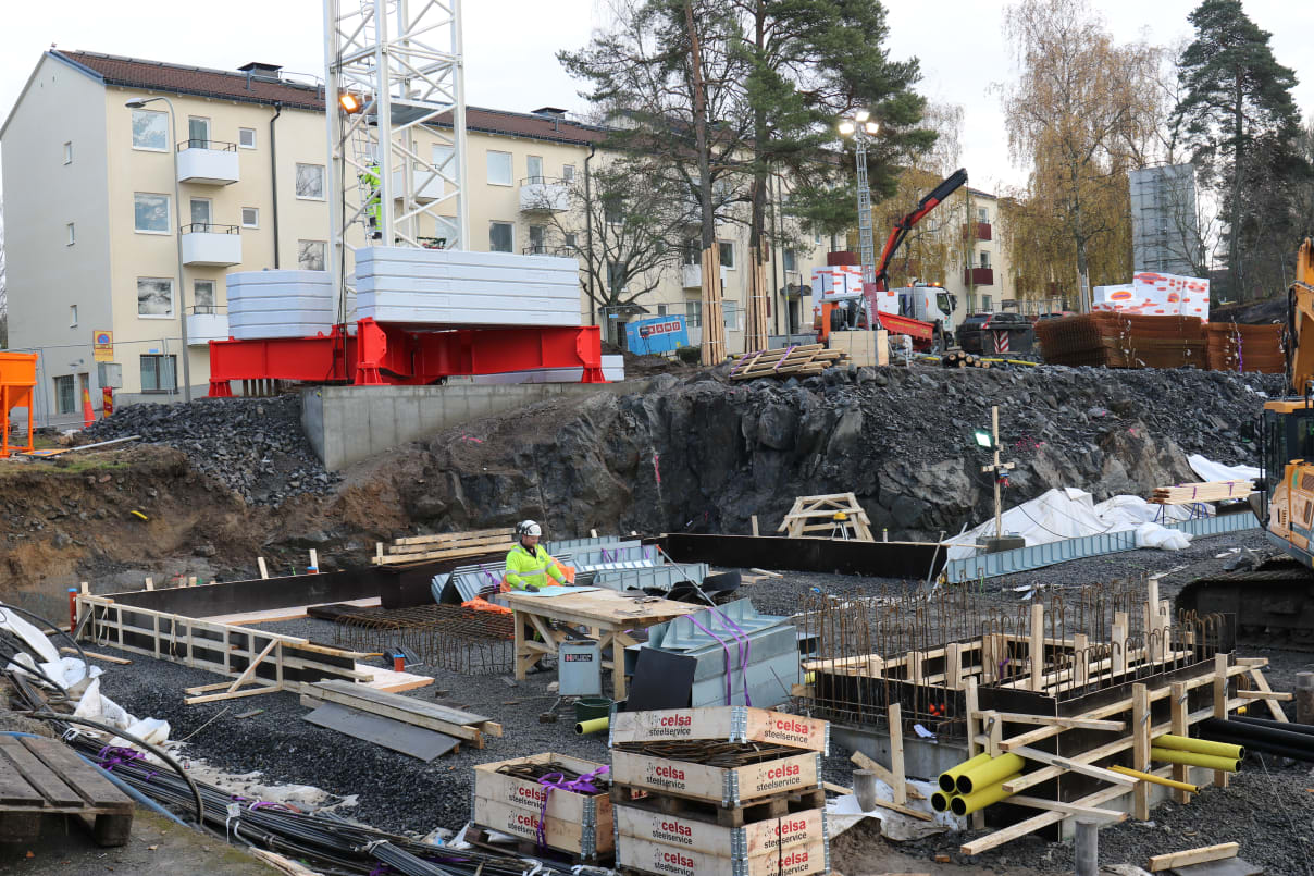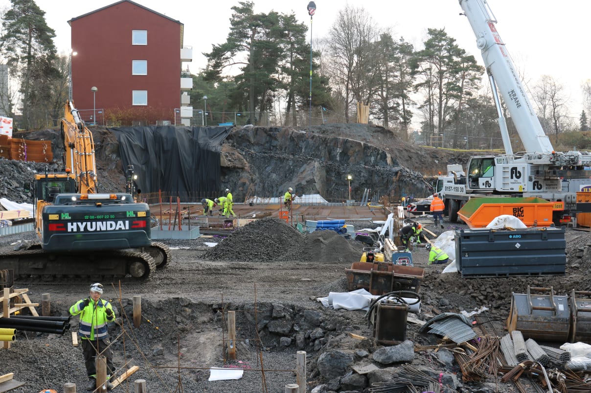 I ena änden av Kaggeholmsvägen finns numera en gigantisk grop. Jord och berg är bortfraktat och i gropen pågår förberedelser för husgrunden. Det nya kvarteret blir granne med villor på ena sidan och med Familjebostäders trevåningshus på den andra.