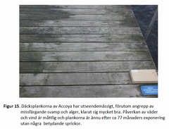 - Begynnande rötangrepp rund skruvskallar observerades efter ca 40 månader i jättetuja (Western red cedar) och roble.